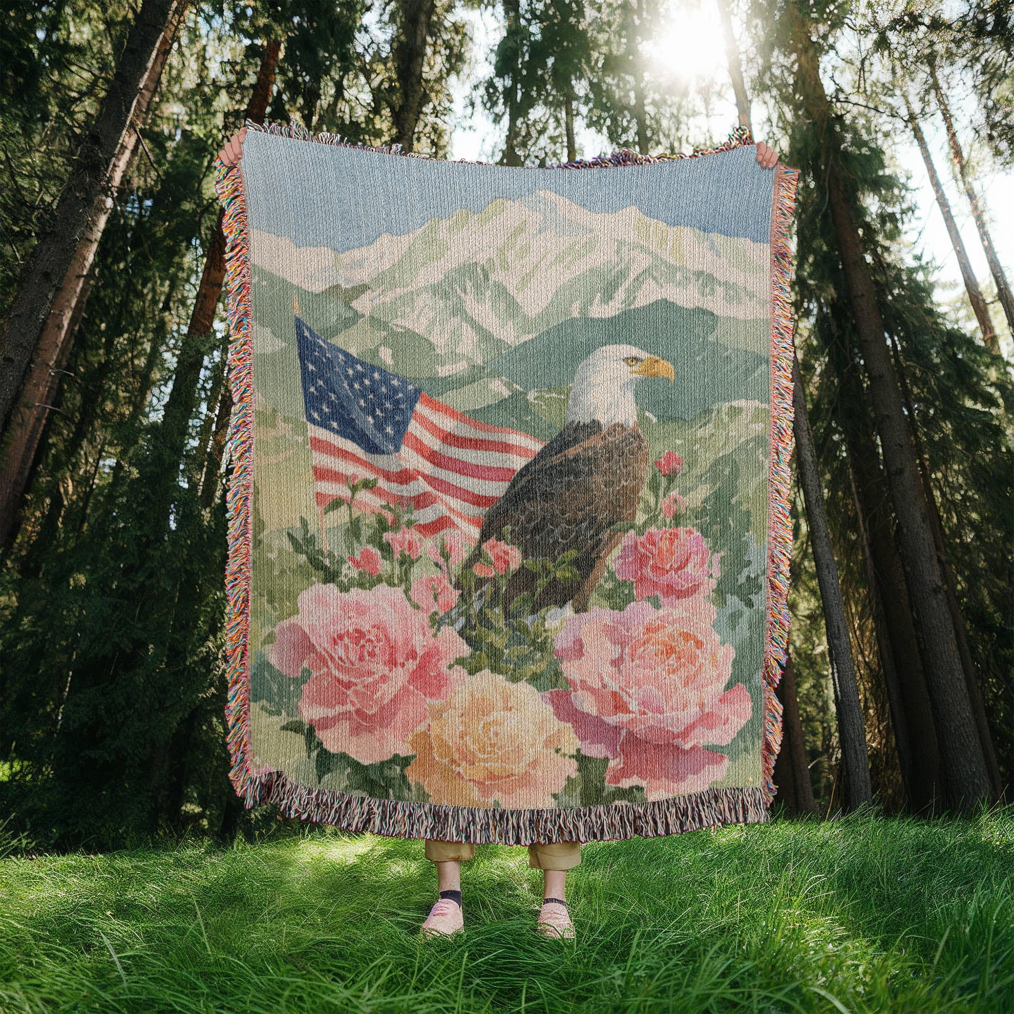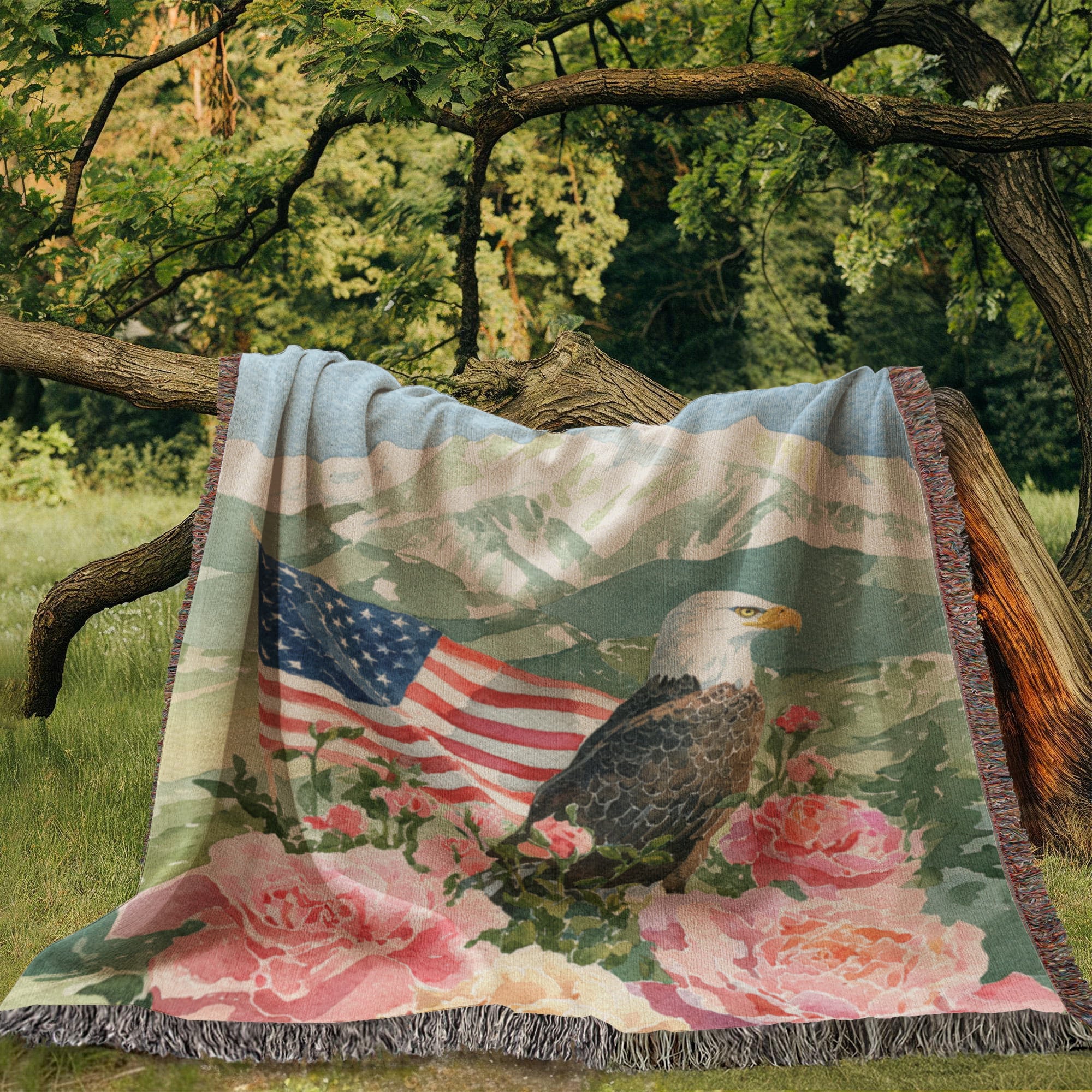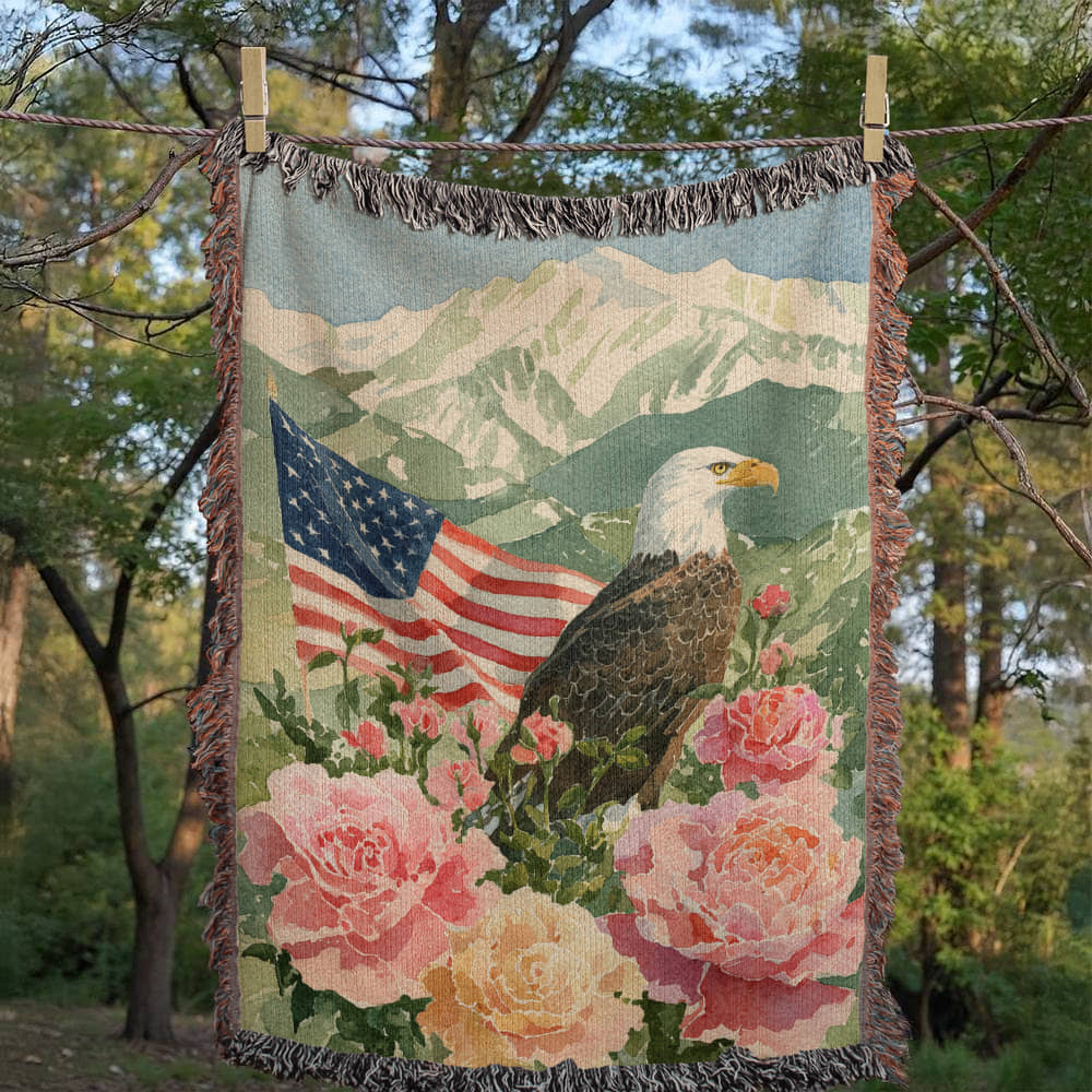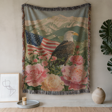 Celebrate American pride with this beautiful and patriotic woven blanket. This custom-designed throw features a majestic bald eagle perched among soft roses, with a waving American flag and a scenic mountain backdrop. It's the perfect blend of national symbolism and timeless, rustic art.
