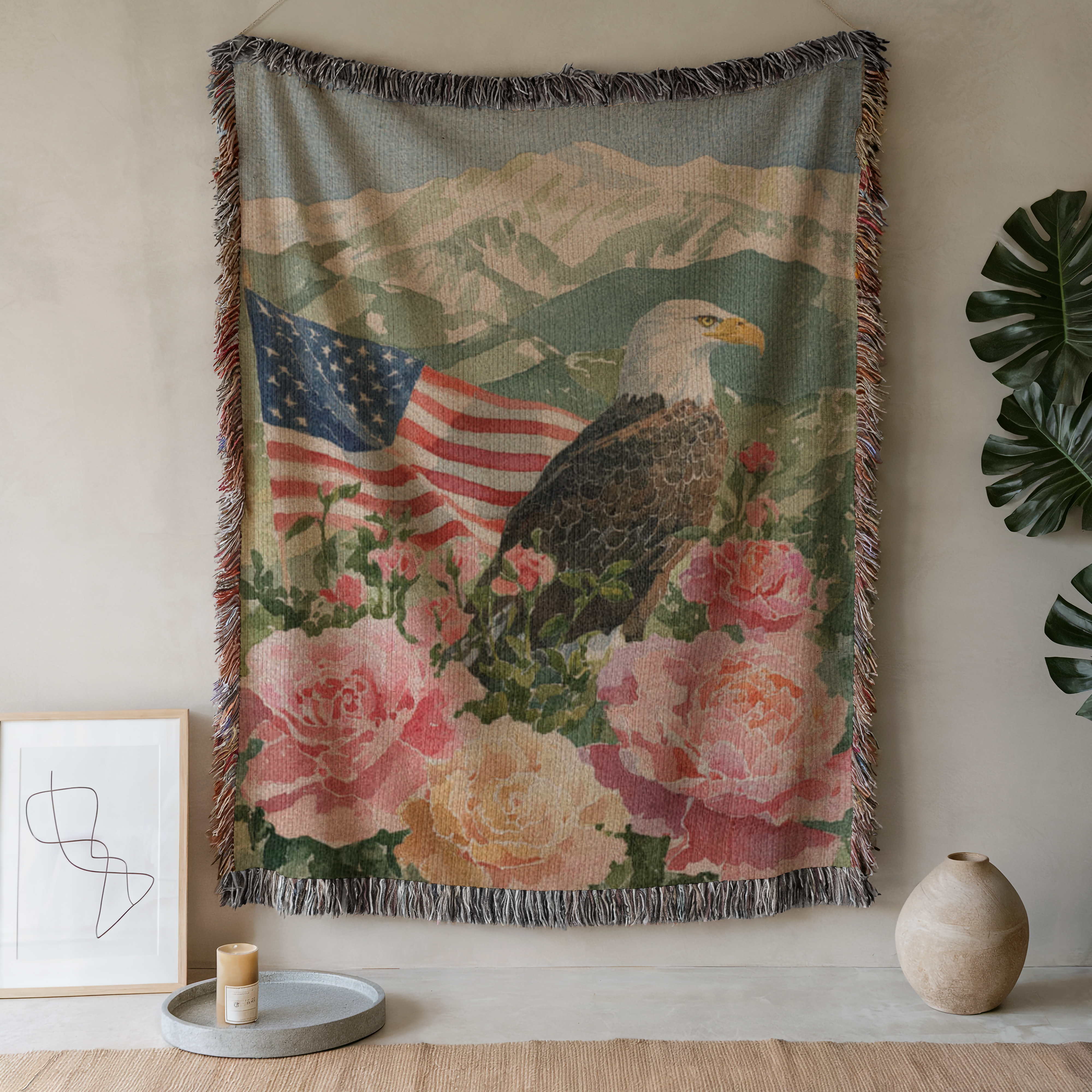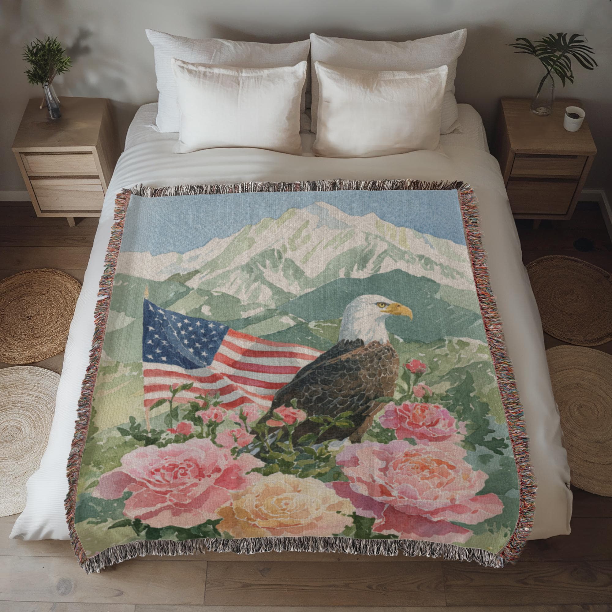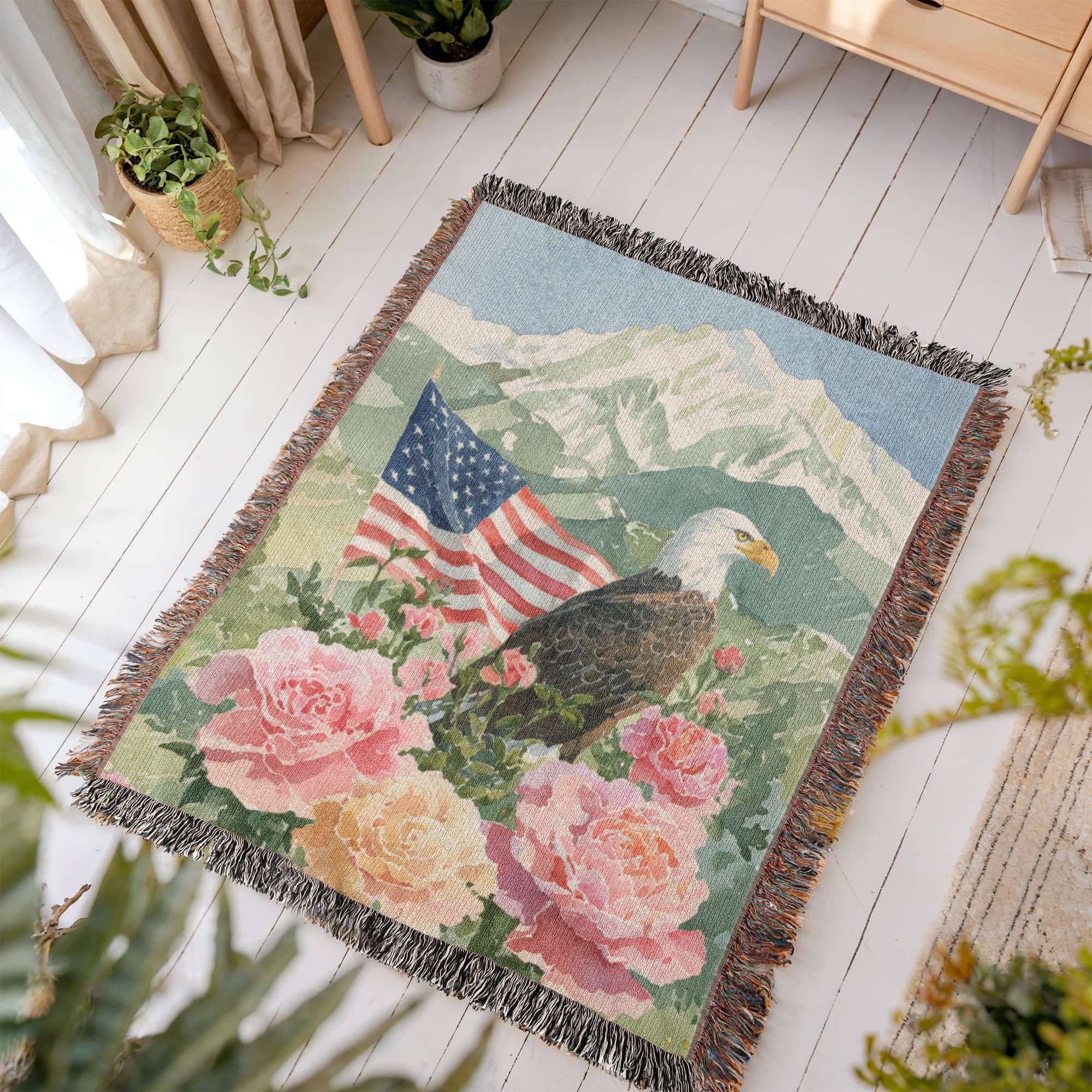 Celebrate American pride with this beautiful and patriotic woven blanket. This custom-designed throw features a majestic bald eagle perched among soft roses, with a waving American flag and a scenic mountain backdrop. It's the perfect blend of national symbolism and timeless, rustic art.