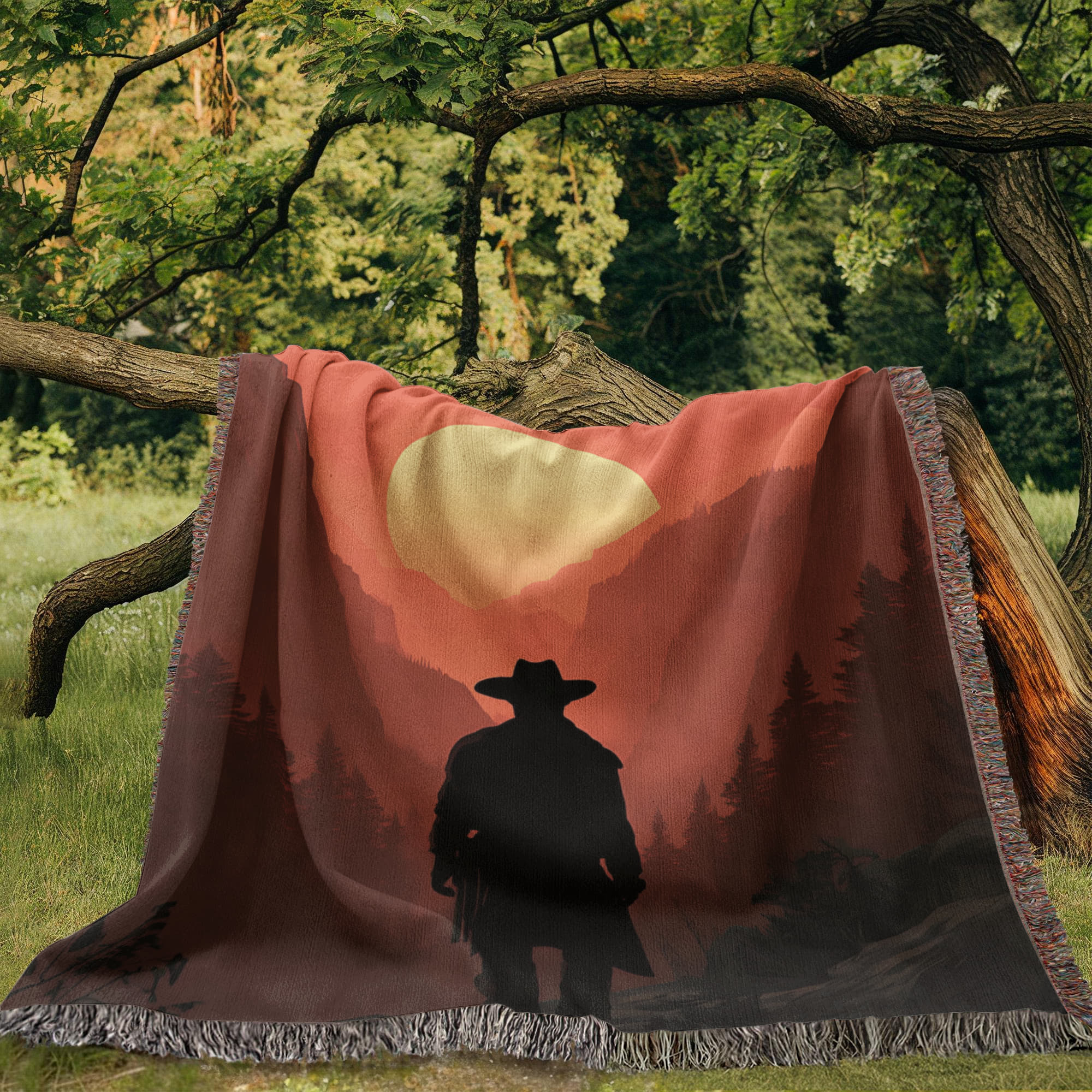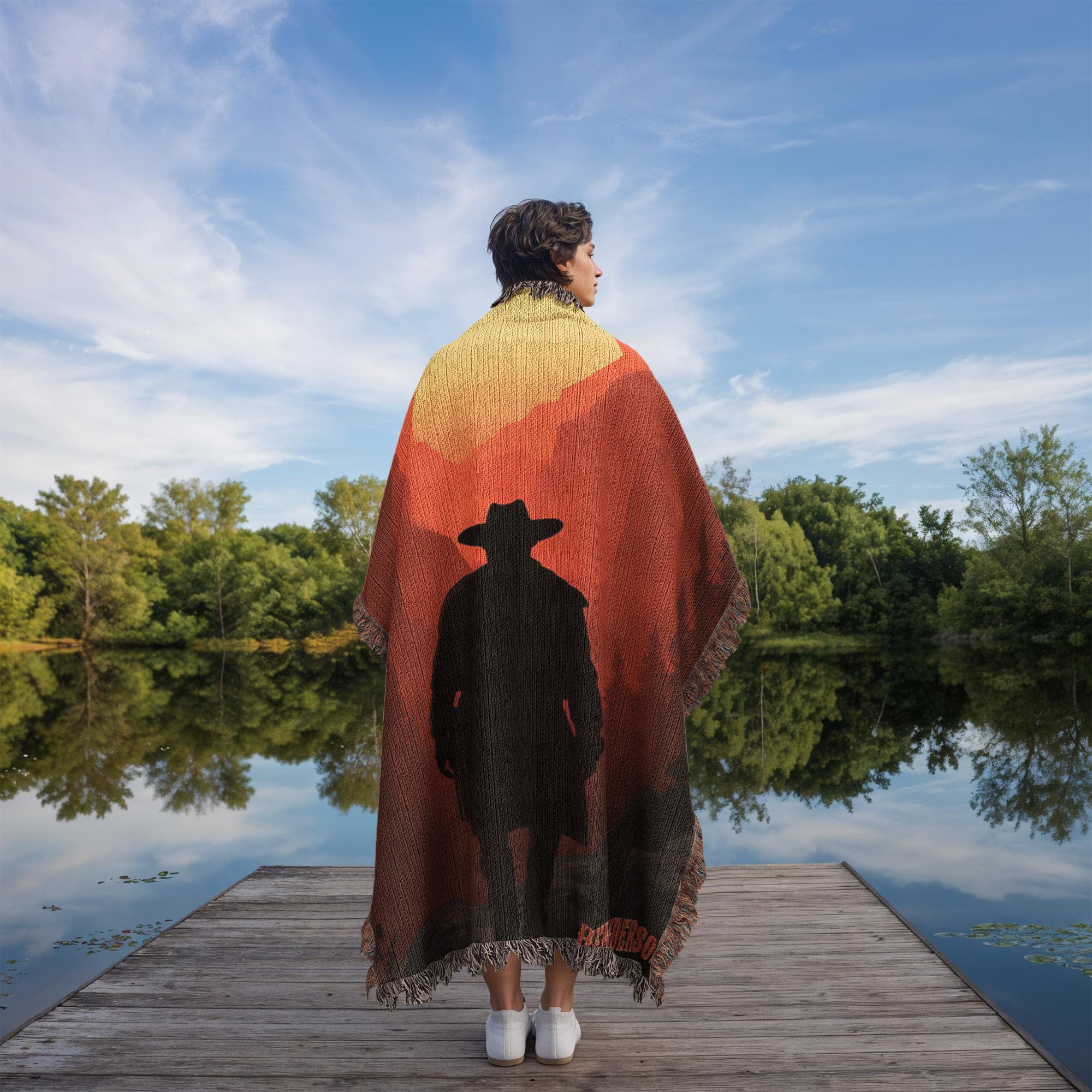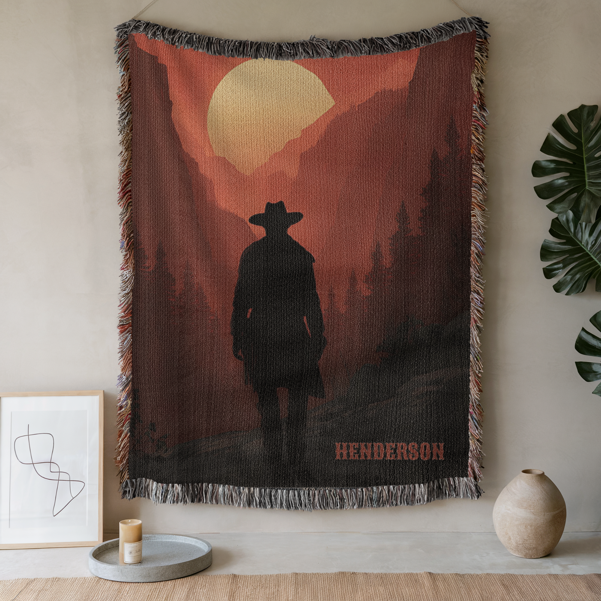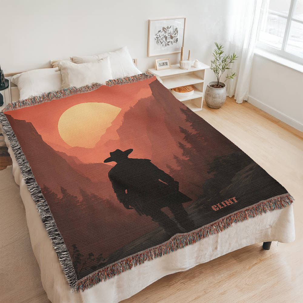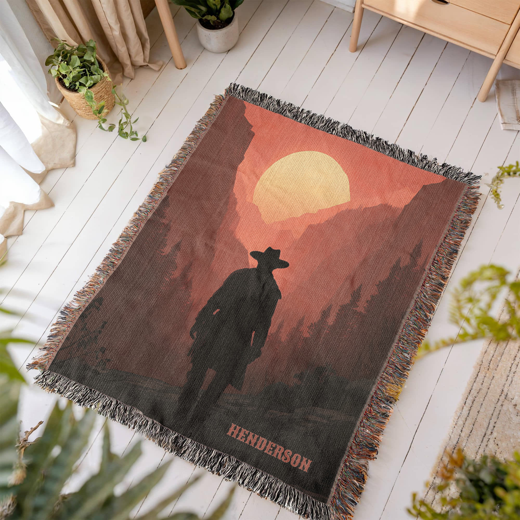 Embark on a journey to the Wild West from the comfort of your home with this magnificent Personalized Cowboy Woven Blanket! Featuring a dramatic silhouette of a cowboy against a breathtaking sunset over majestic canyons, this throw captures the spirit of adventure and rugged beauty. Customizable with a name, this blanket makes a truly unique and thoughtful gift for cowboys, Western enthusiasts, or anyone who loves frontier art. Made from soft cotton, it offers exceptional comfort and warmth, and is available in three versatile sizes (, , and ) to perfectly suit your sofa, bed, or wall display. Complete with fringed edges for a classic, heirloom feel, this decorative Western throw is an ideal addition to your rustic home decor or man cave.