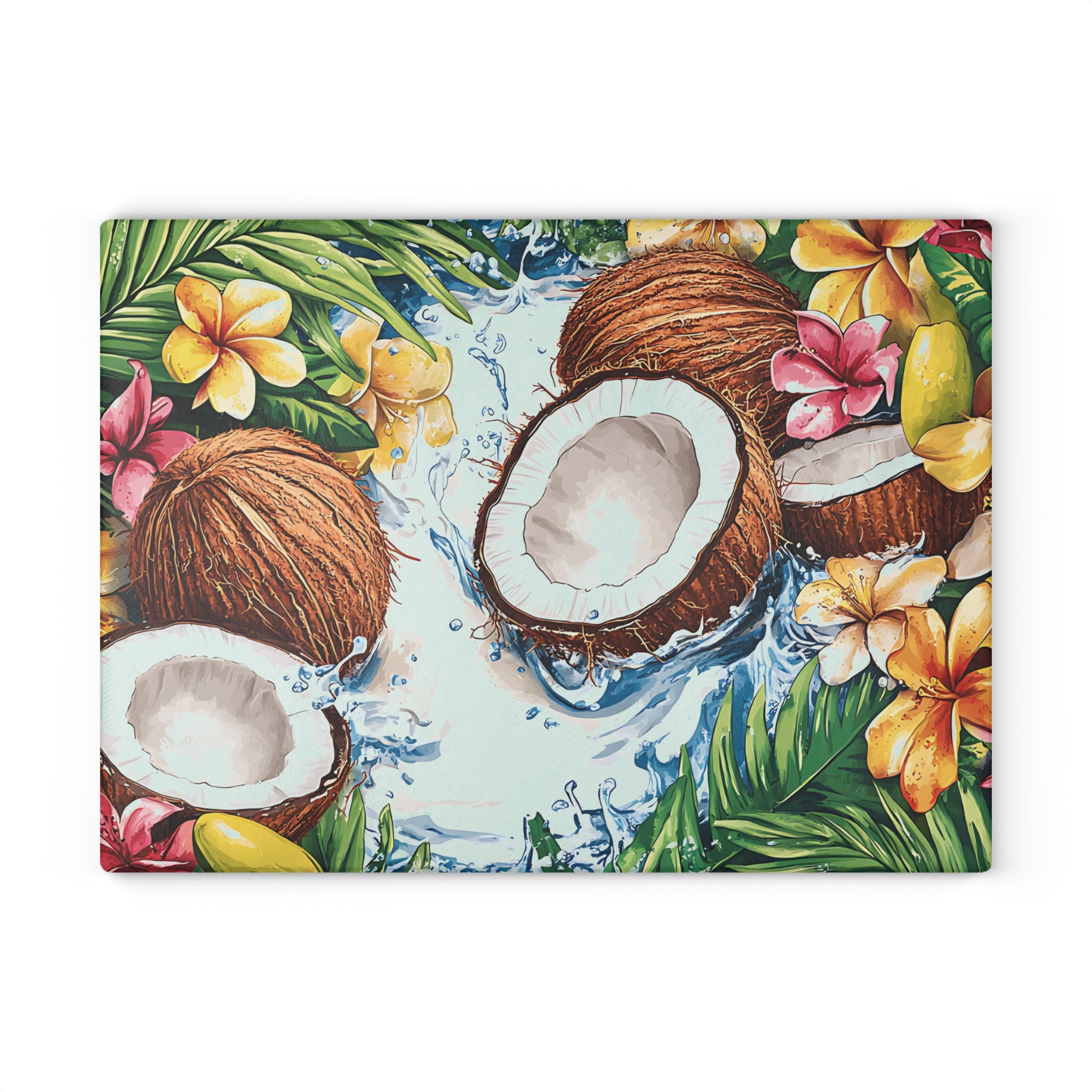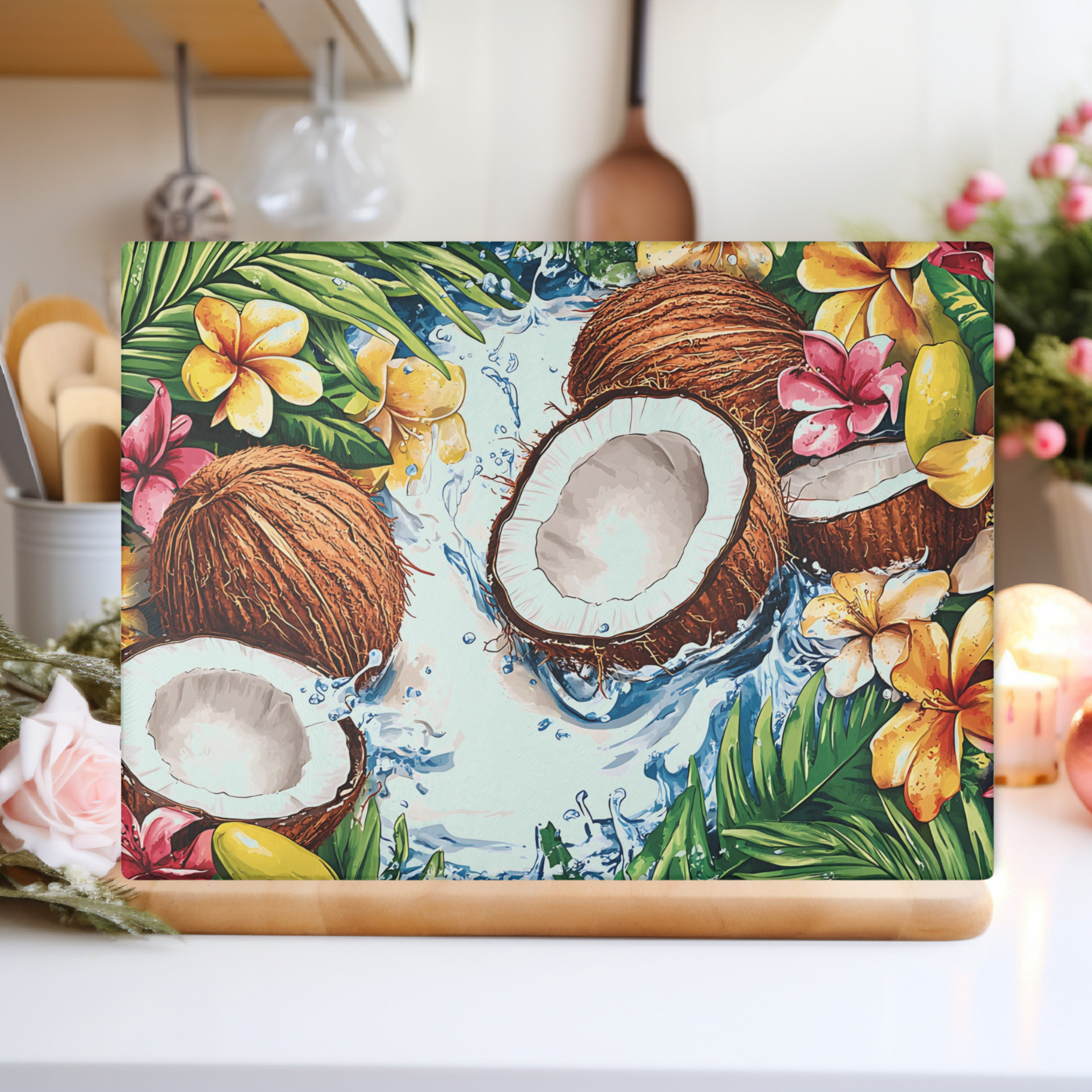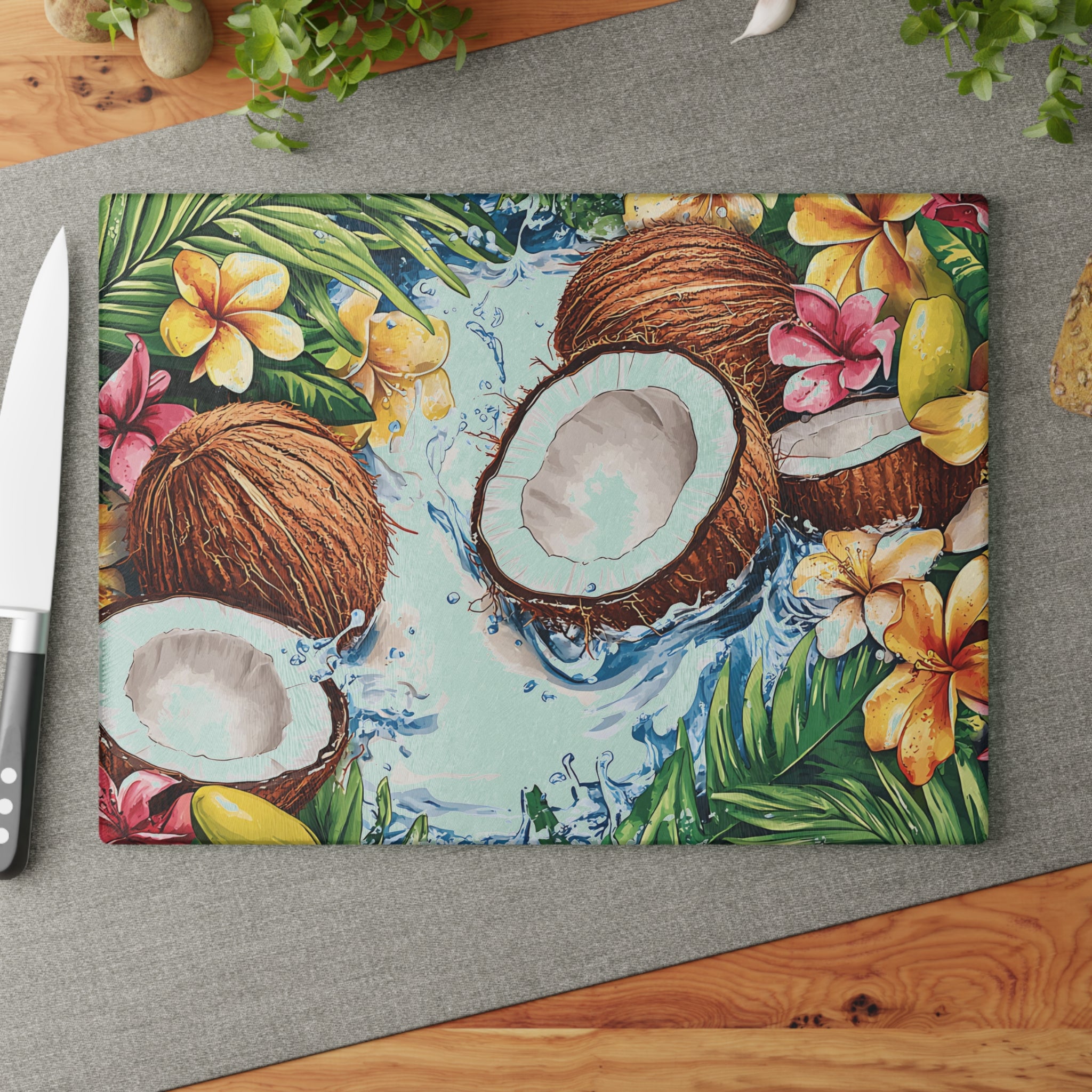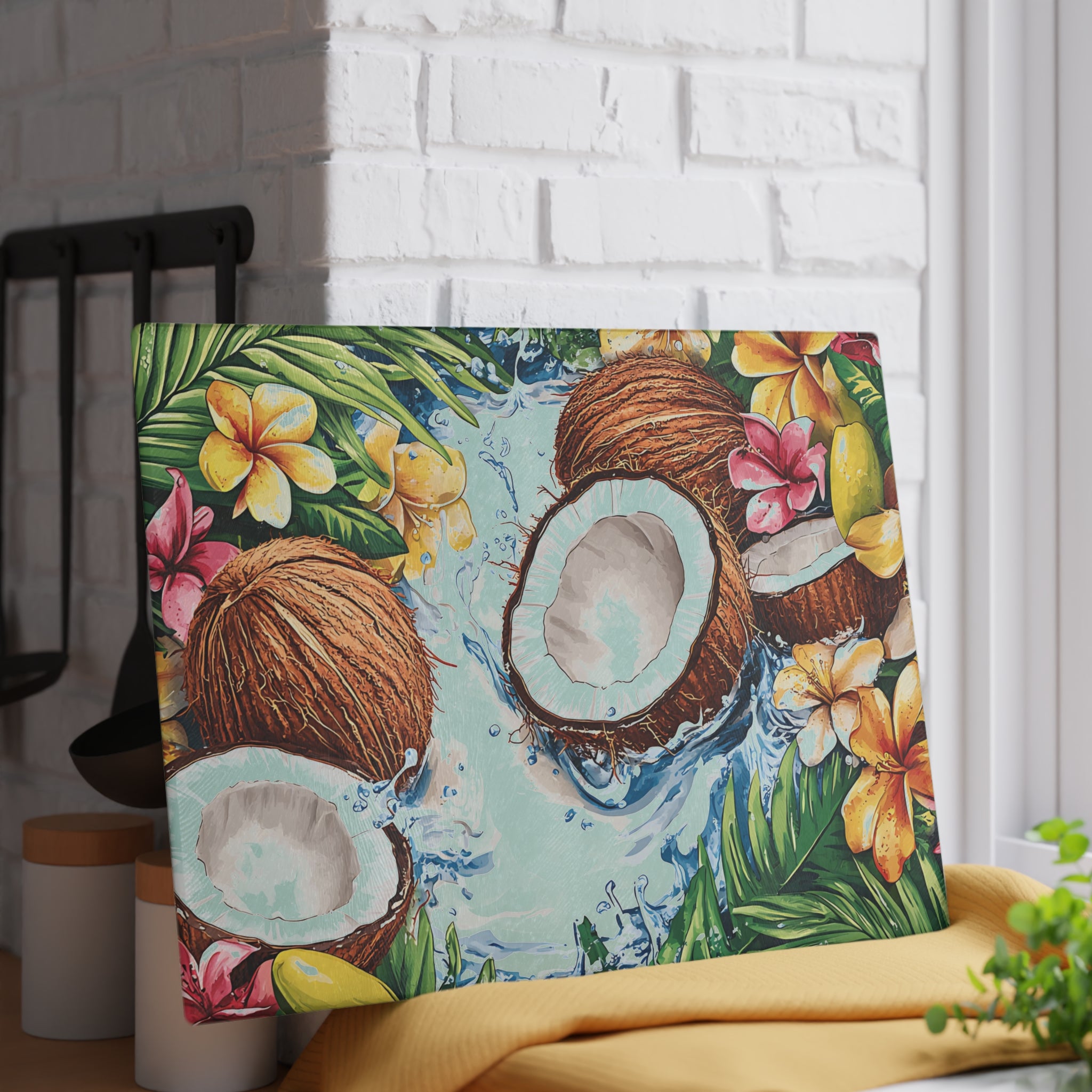 Bring the tropics to your kitchen with this vibrant glass cutting board, featuring splashing coconut juice, juicy mangos, and lush tropical flowers. Made of durable tempered glass with a textured surface, it's perfect for meal prep, serving, or vibrant decor. A cheerful gift for beach lovers, summer hosts, or anyone who craves island vibes in their home.