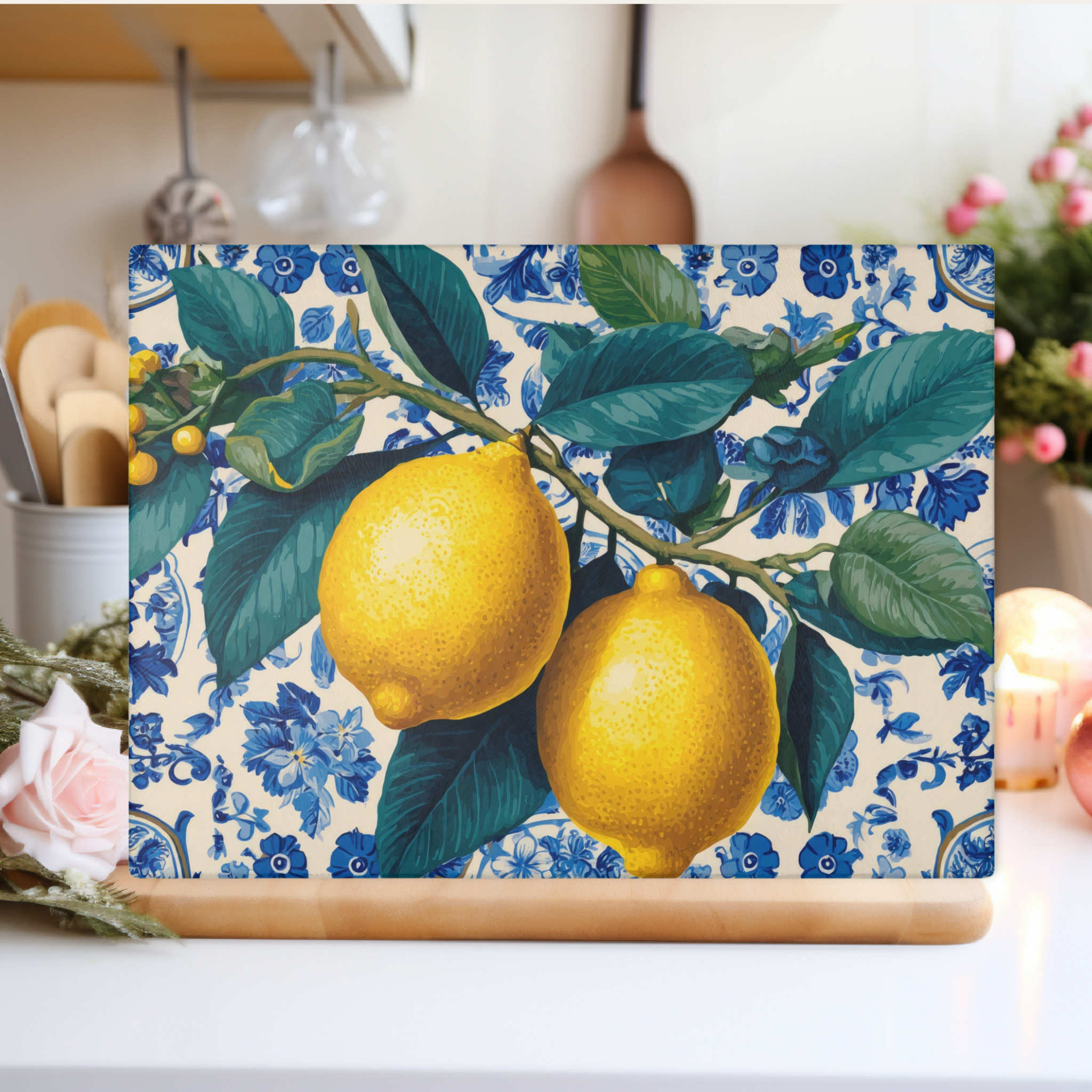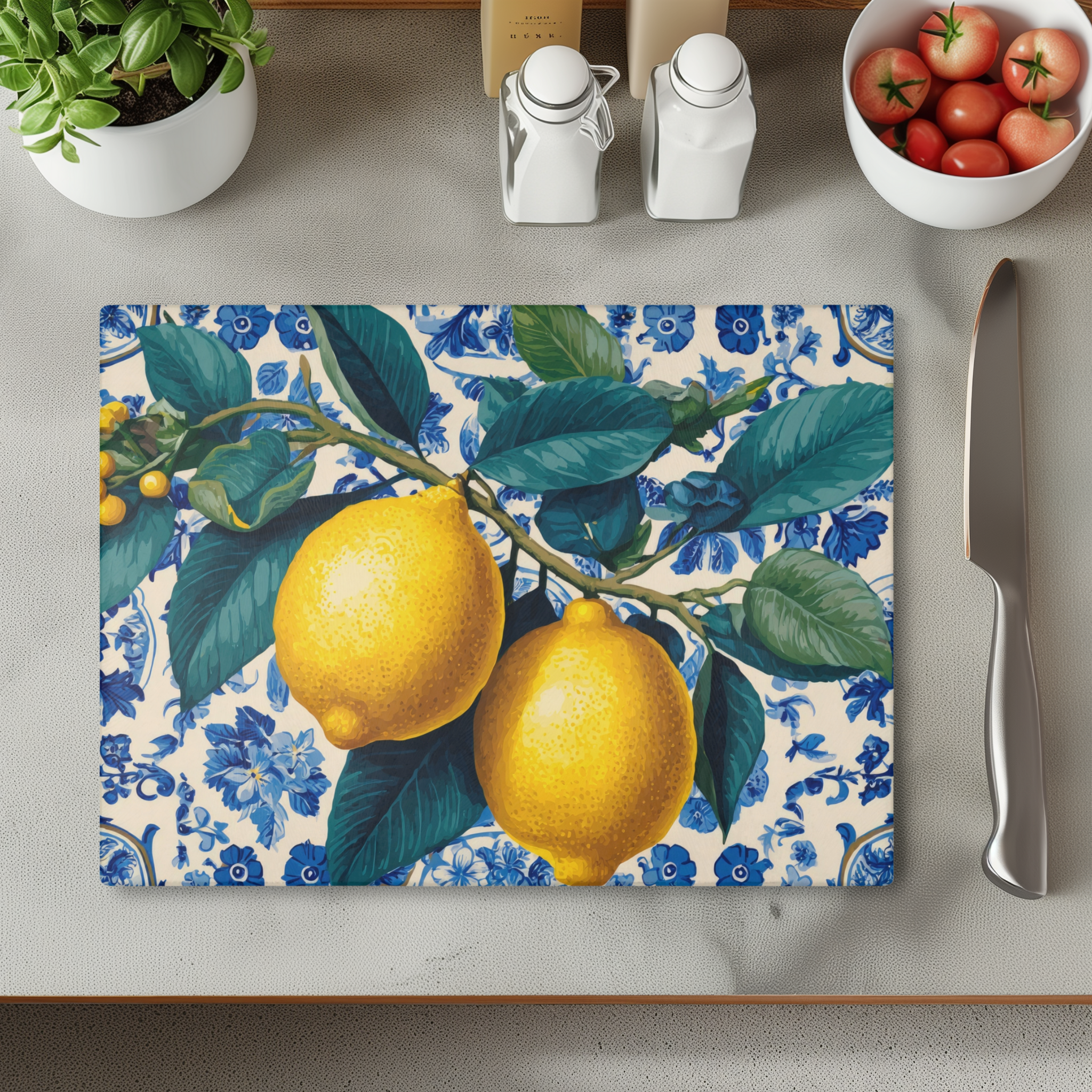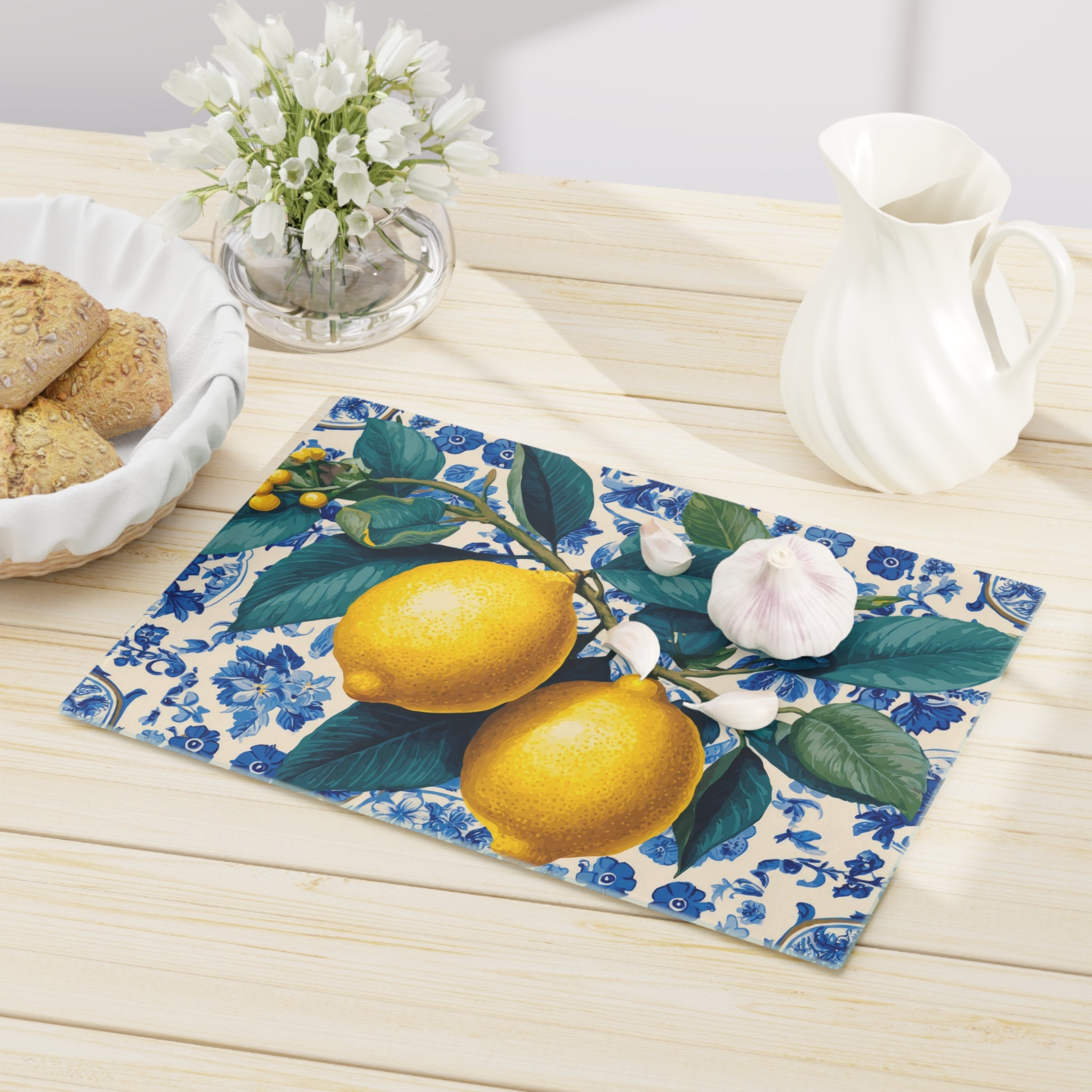 Add a burst of sunshine to your kitchen with our vibrant Lemon Glass Cutting Board. This beautiful and functional piece features a bright lemon pattern, perfect for a fresh, Mediterranean-inspired kitchen aesthetic. Made from durable and hygienic tempered glass, this board is not only ideal for chopping fruits and vegetables but also serves as a stylish serving platter for cheese and charcuterie, or as a protective trivet for hot dishes. The sleek design and vivid colors make it a stunning kitchen decor accent that brightens any countertop. A perfect housewarming gift or a cheerful addition to your own home, this lemon-themed kitchen accessory combines practicality with a touch of citrus charm.