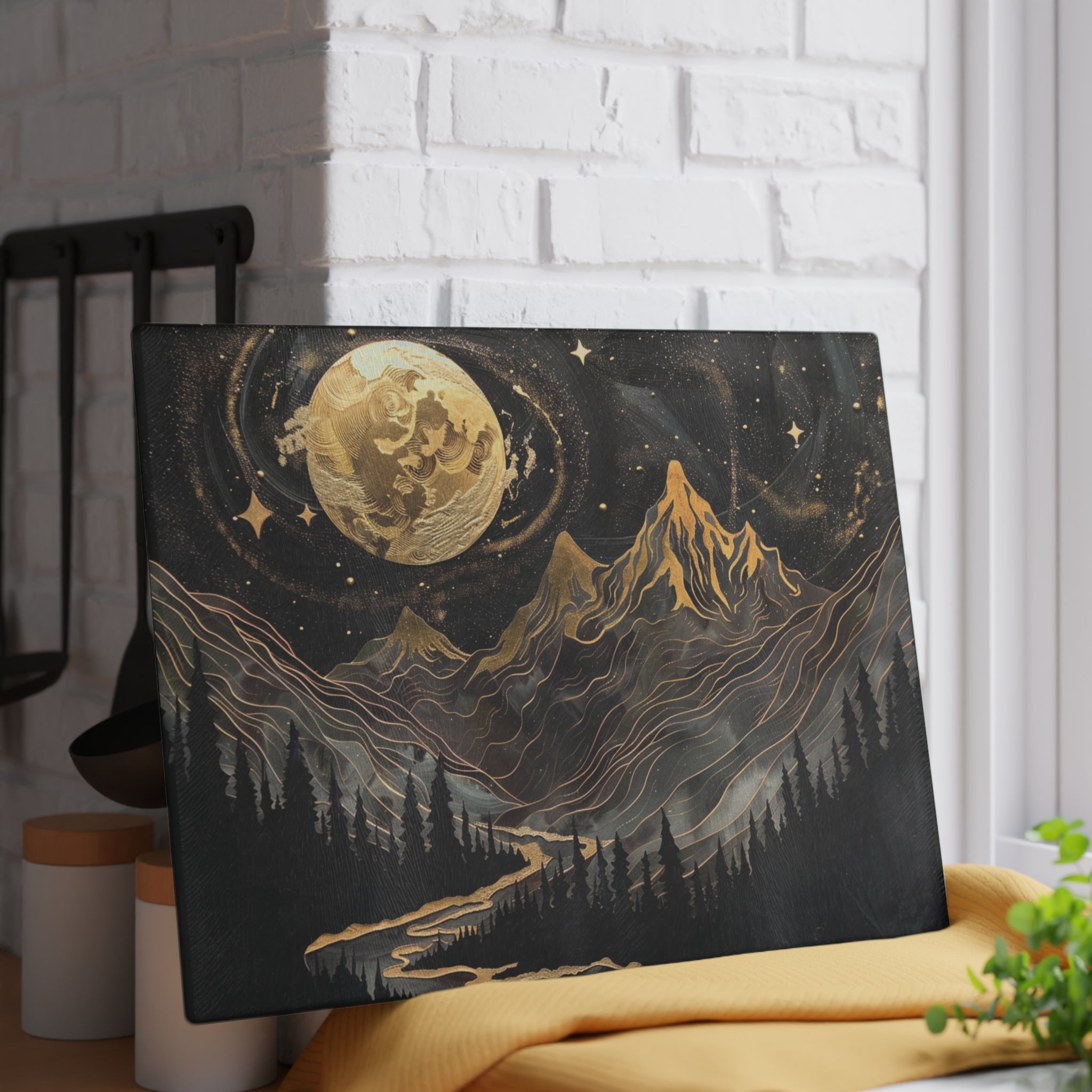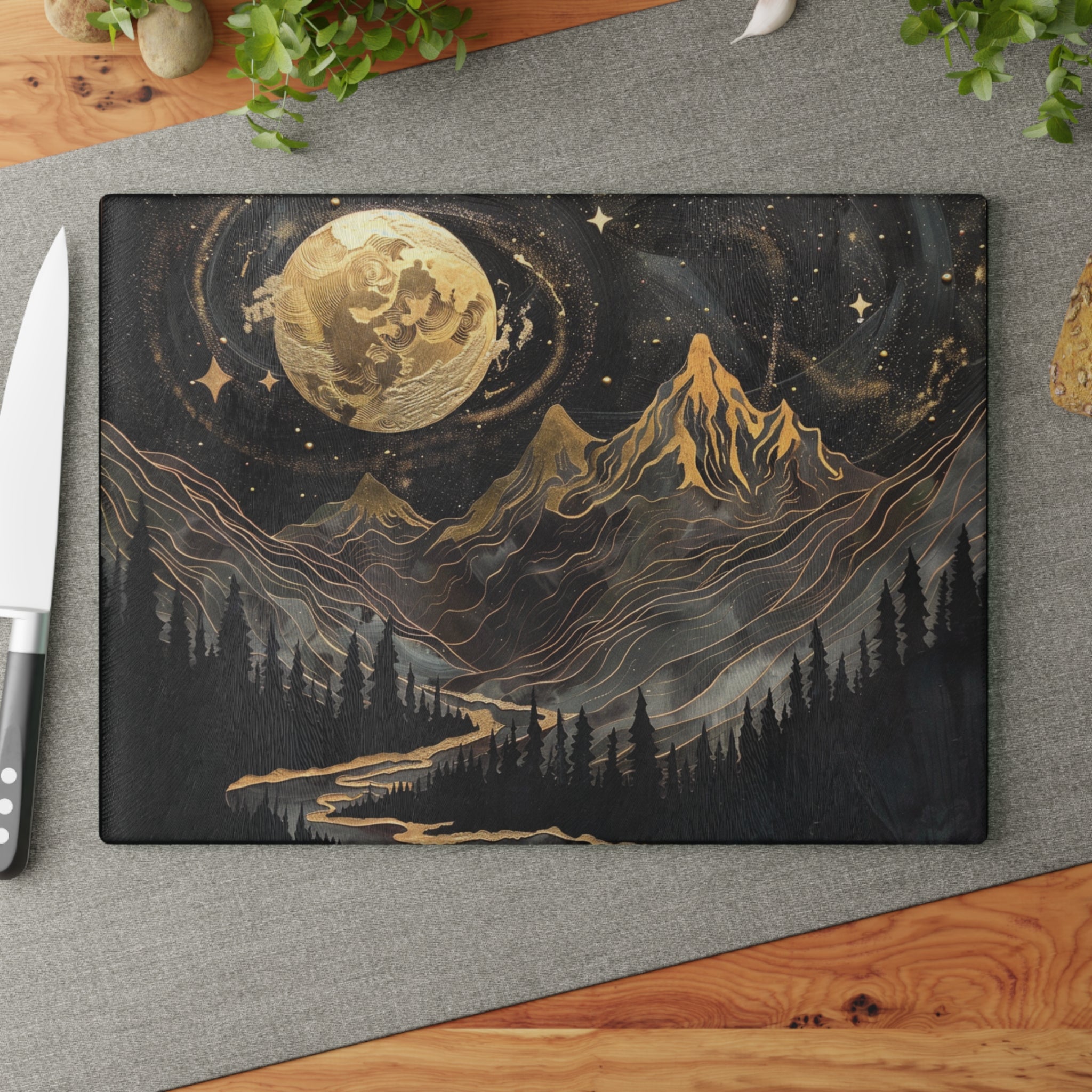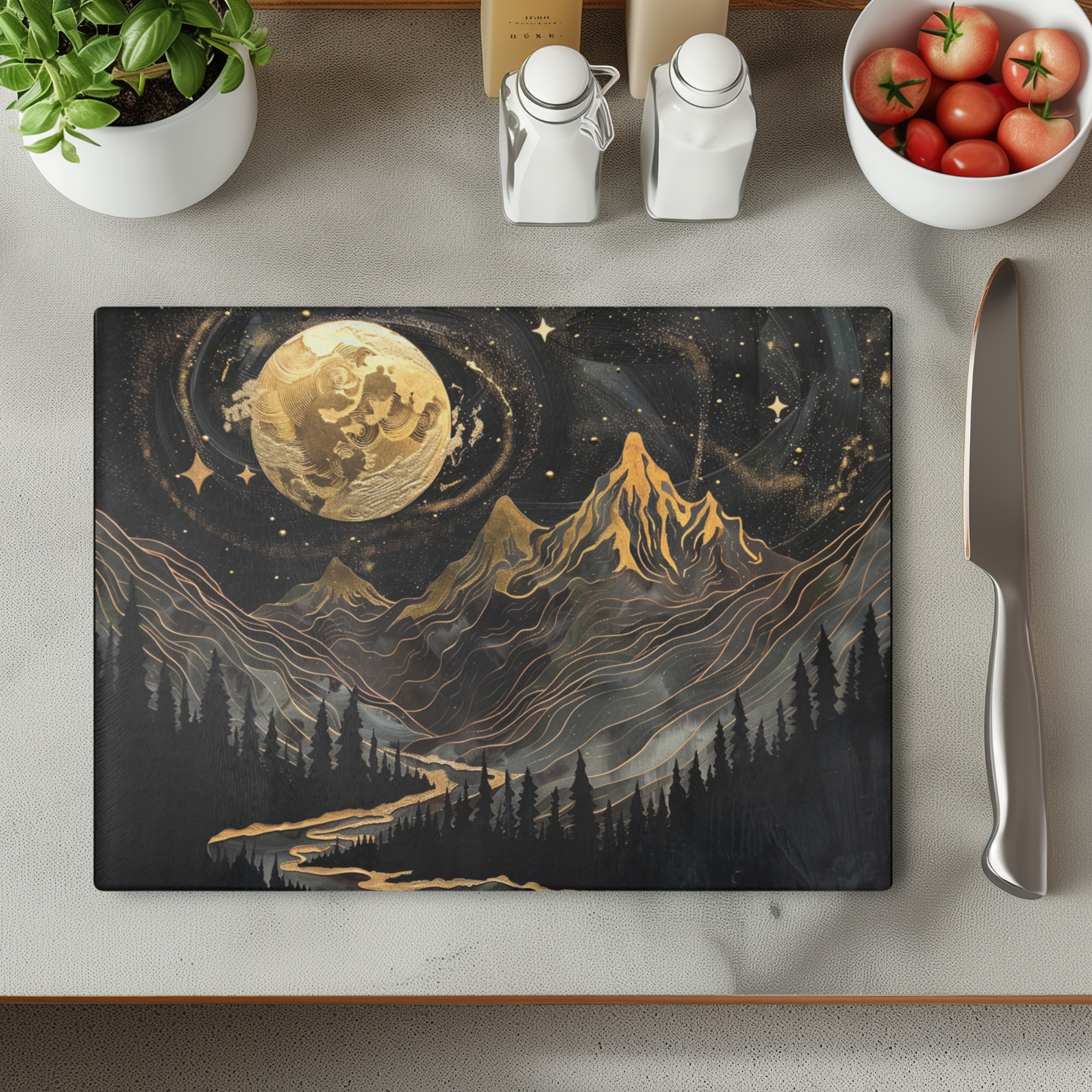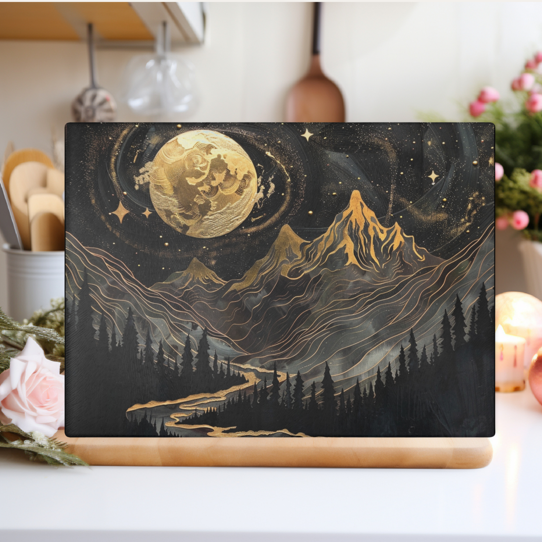 Bring the magic of a starlit night into your kitchen with this stunning mountain-themed glass cutting board. Featuring shimmering gold moonlight over mountain peaks and a winding river, this piece is more than functional — it's art. Perfect for prepping, serving, or simply displaying. A one-of-a-kind gift for nature lovers, stargazers, or anyone who appreciates celestial beauty.