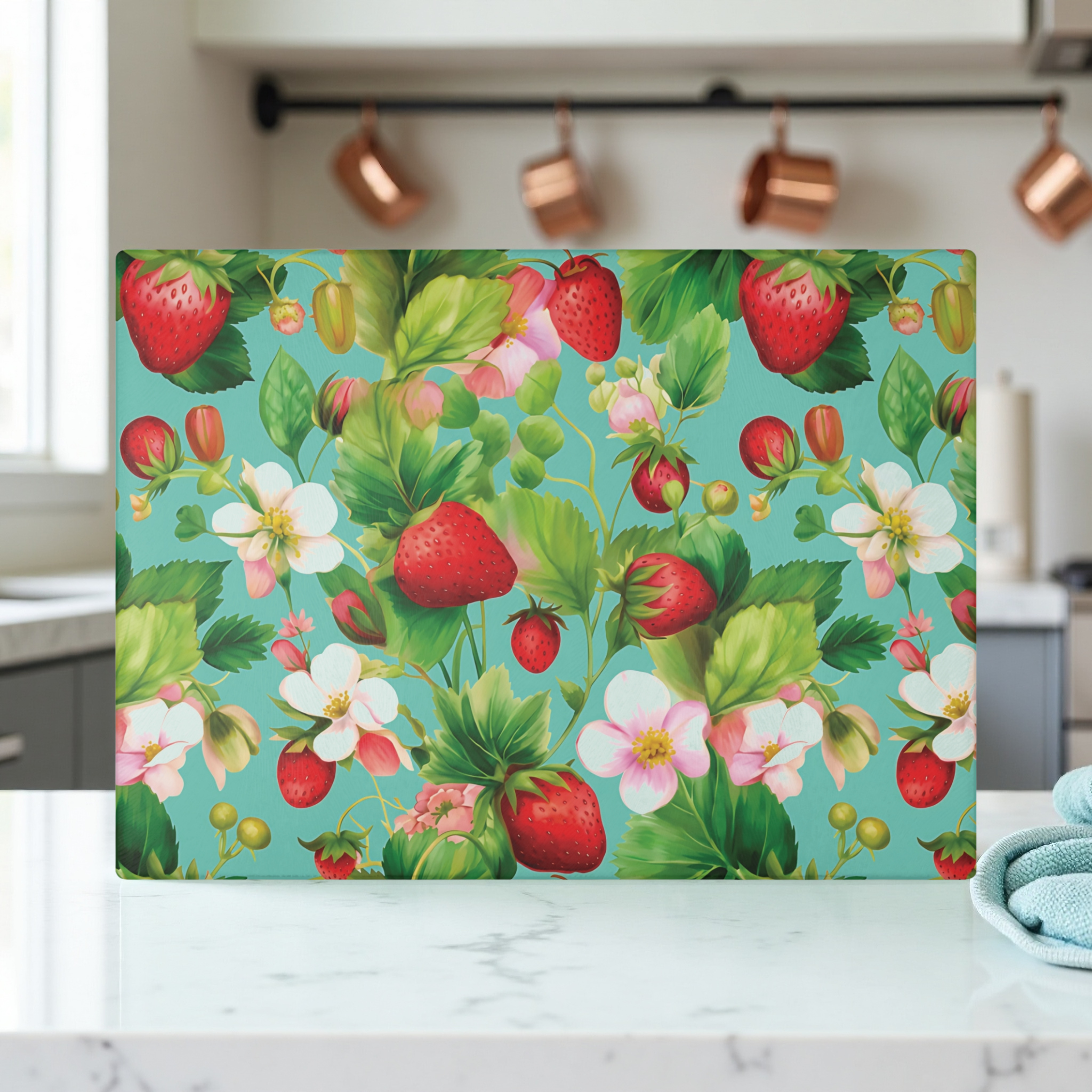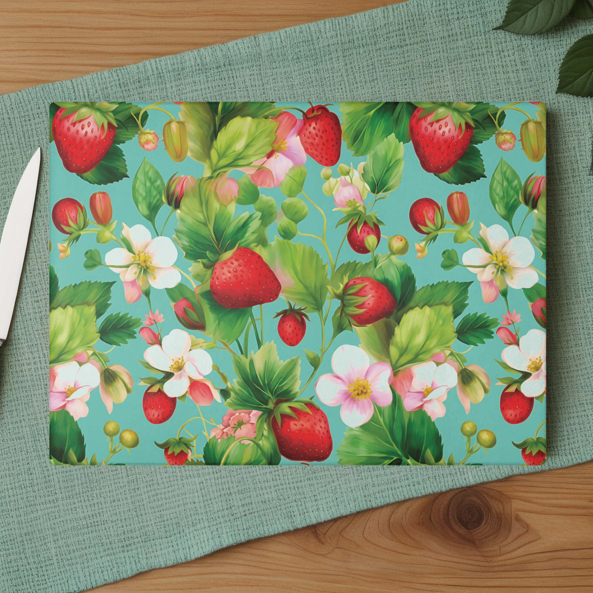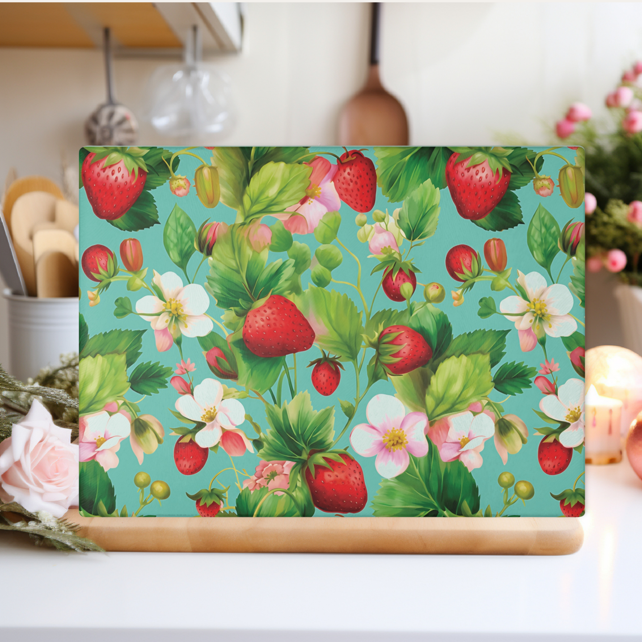 Add a splash of summer sweetness to your kitchen with this Strawberry Floral Glass Cutting Board. Featuring a vibrant watercolor-style pattern of ripe strawberries, delicate blossoms, and fresh green leaves, this cutting board brings joyful garden vibes to your countertop. Made of durable tempered glass with a lightly textured, non-slip surface, it's perfect for chopping, serving, or displaying as part of your kitchen décor. Whether you're prepping for a summer garden party or gifting a fruit-loving foodie, this board is as functional as it is beautiful.