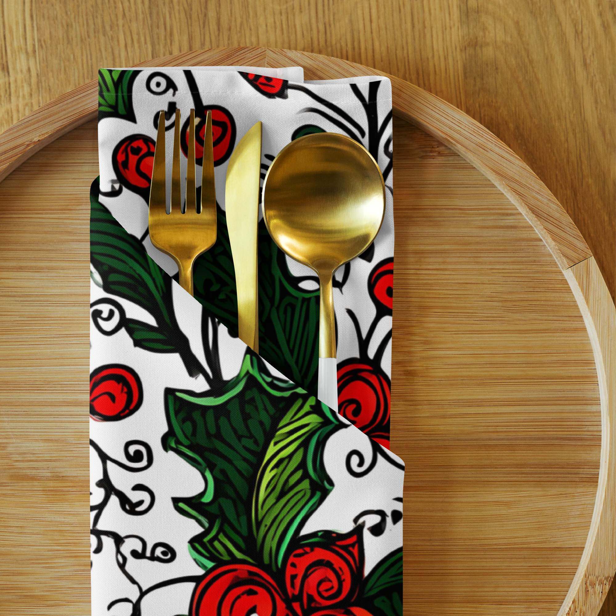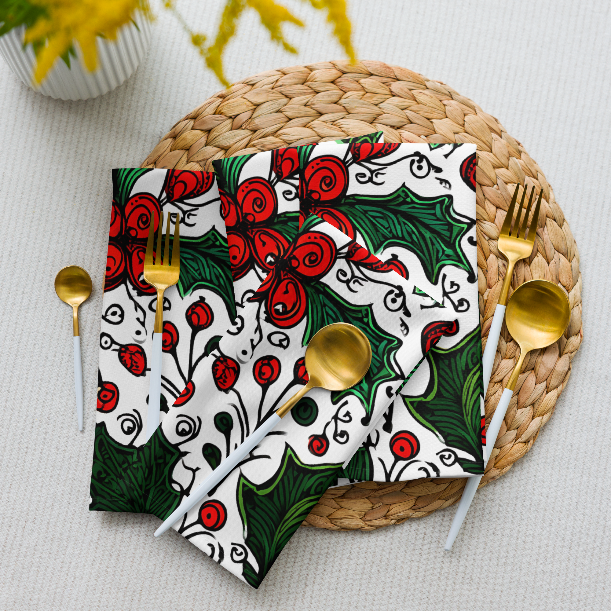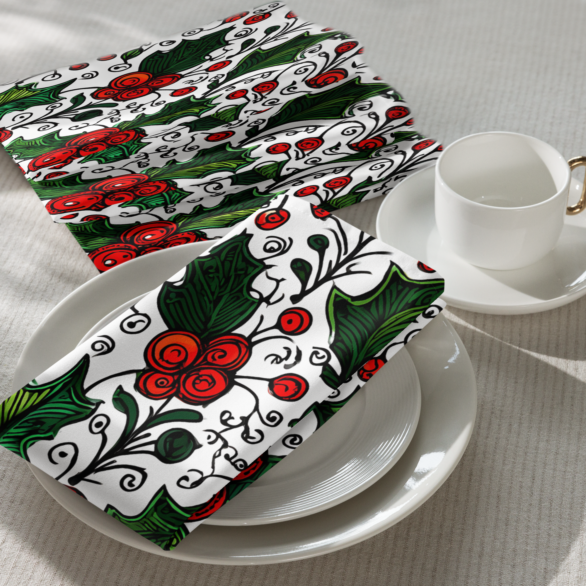 Whimsical Christmas Holly Cloth Napkins – Set of 4 Table Napkins