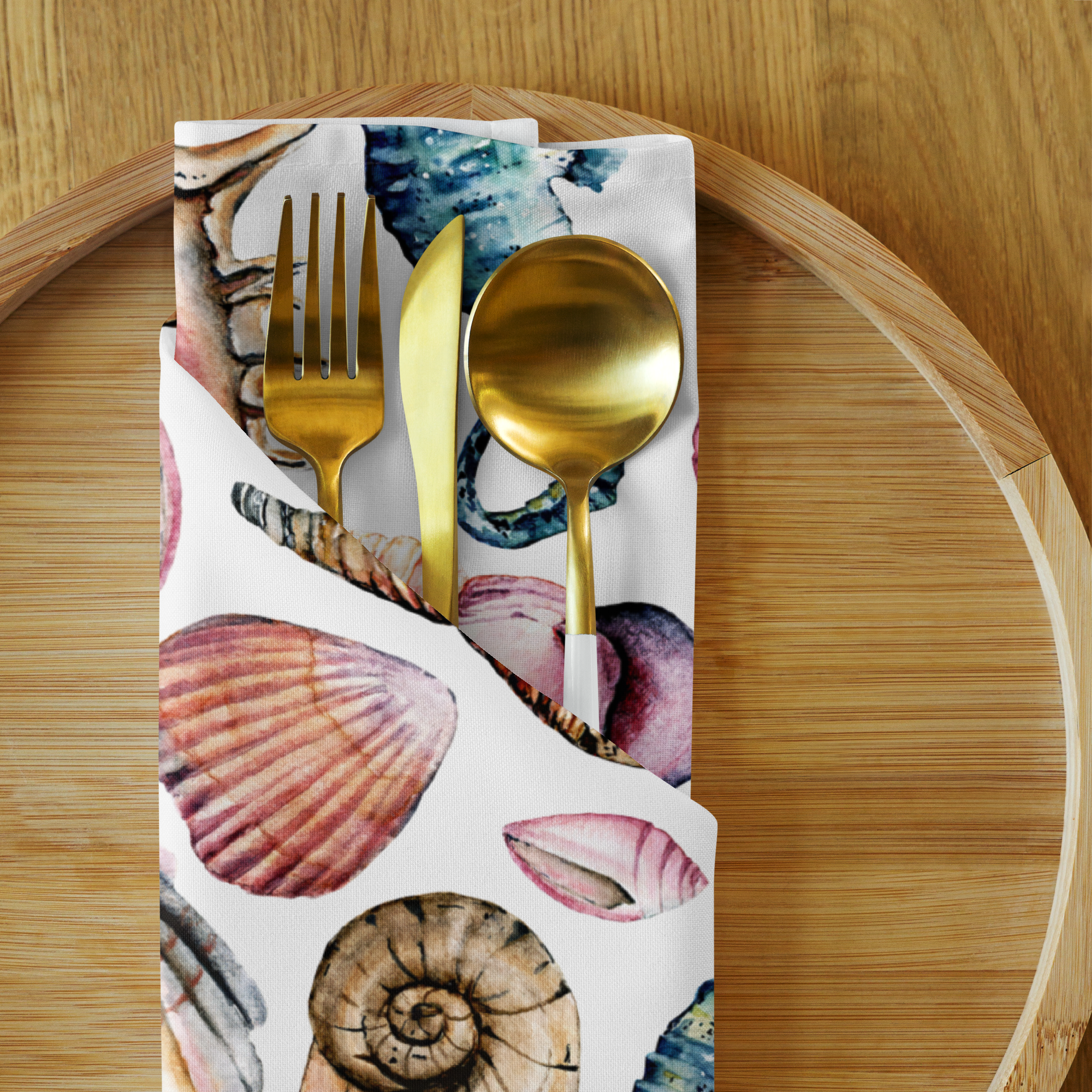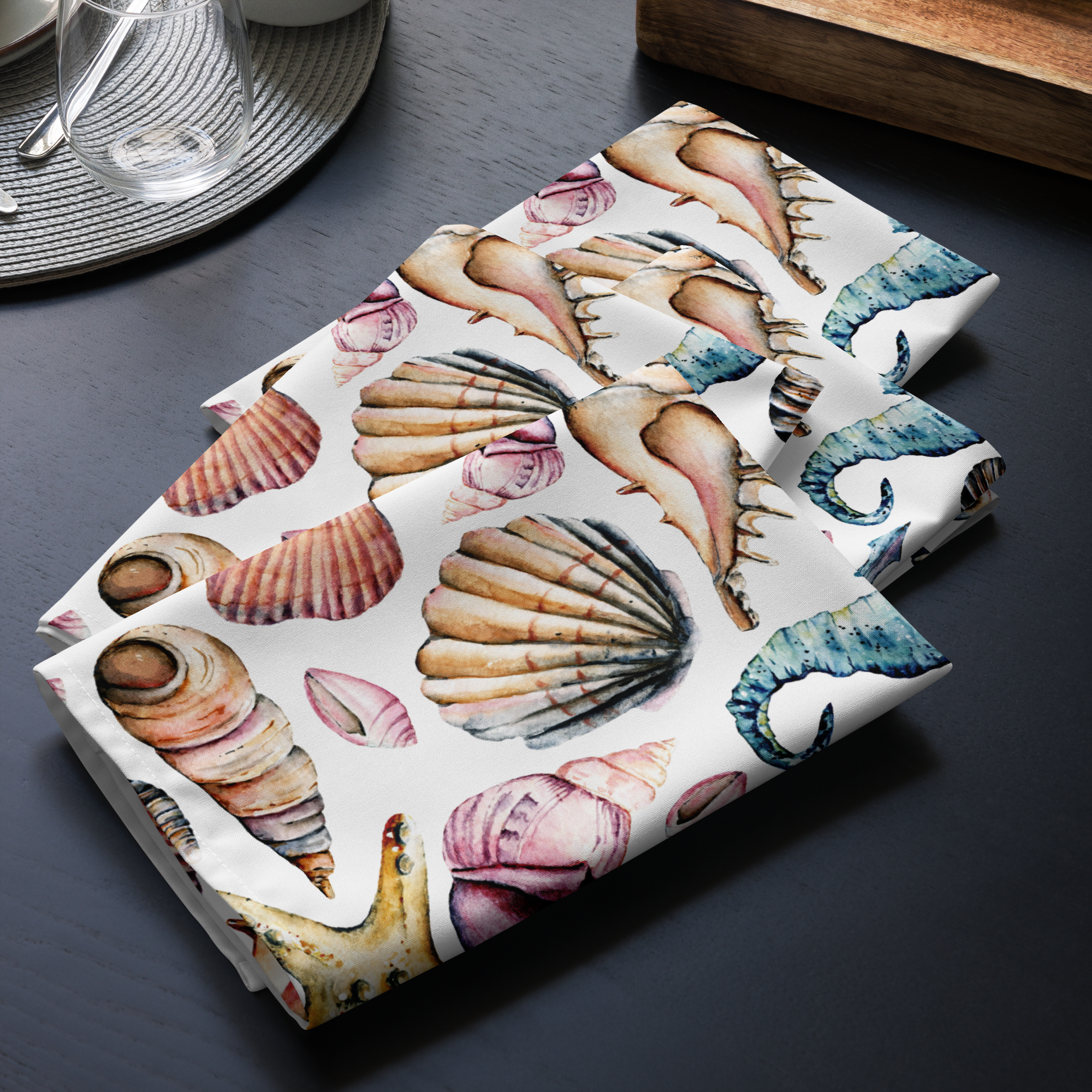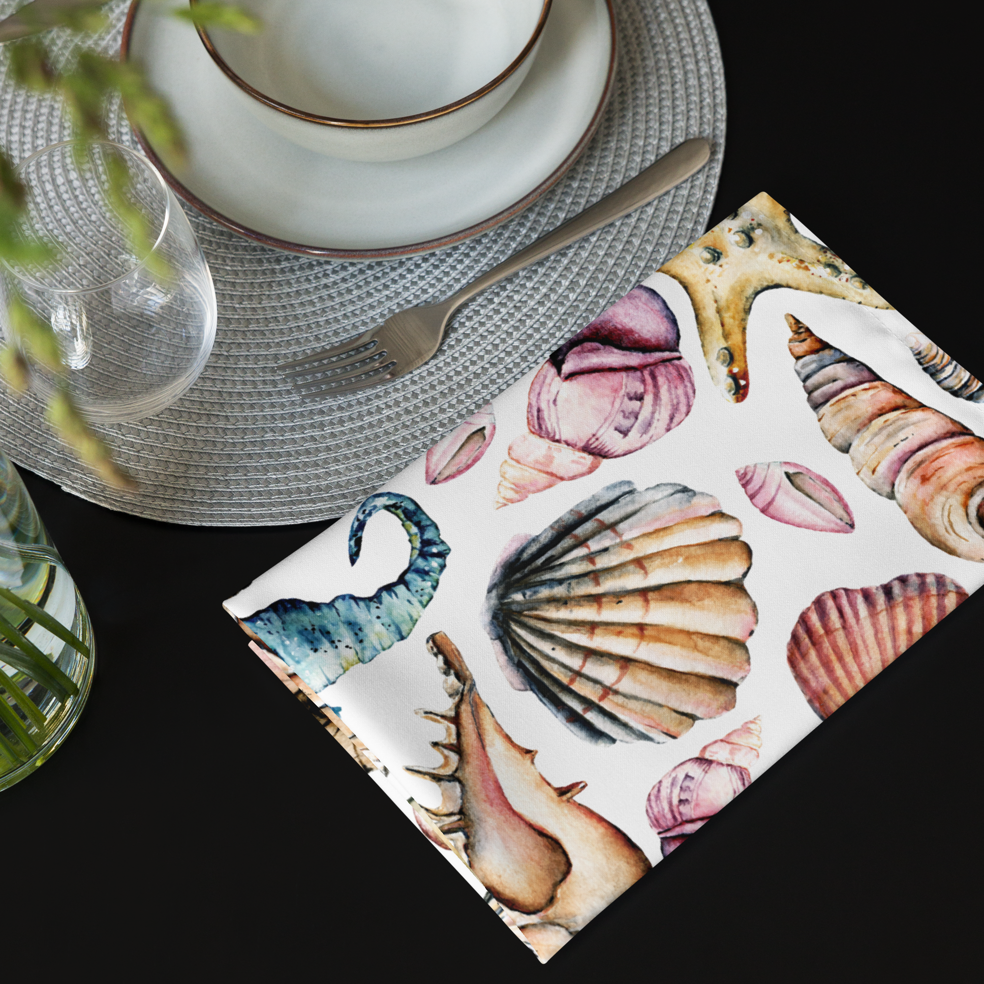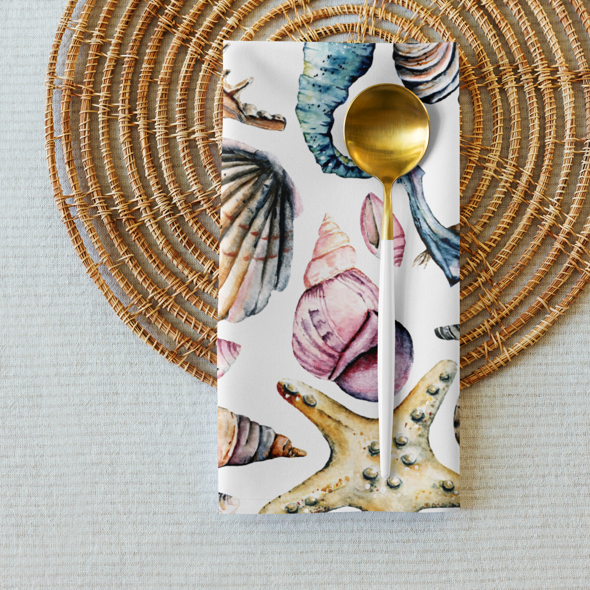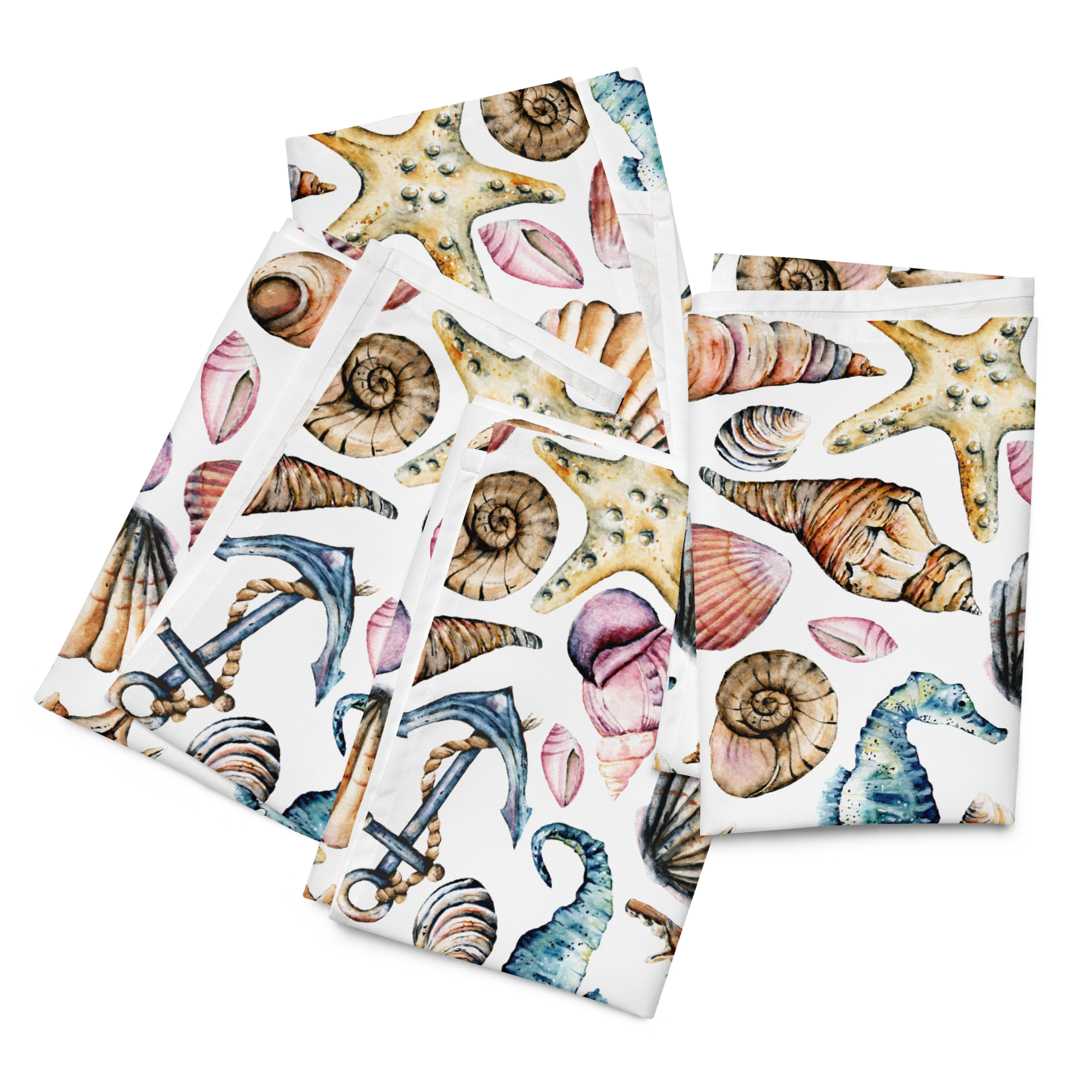 Bring effortless coastal charm to your table with this Set of 4 Coastal Seashell & Marine Life Cloth Napkins, designed to elevate everyday meals and special gatherings alike. Featuring a beautifully detailed ocean-inspired pattern of seashells, seahorses, starfish, and anchors, these napkins add a fresh beach-house elegance to any dining space. Made from durable, water-resistant polyester broadcloth, each napkin is soft, long-lasting, and perfect for coastal décor lovers who want to bring a touch of the seaside to their home, vacation rental, or summer celebrations.