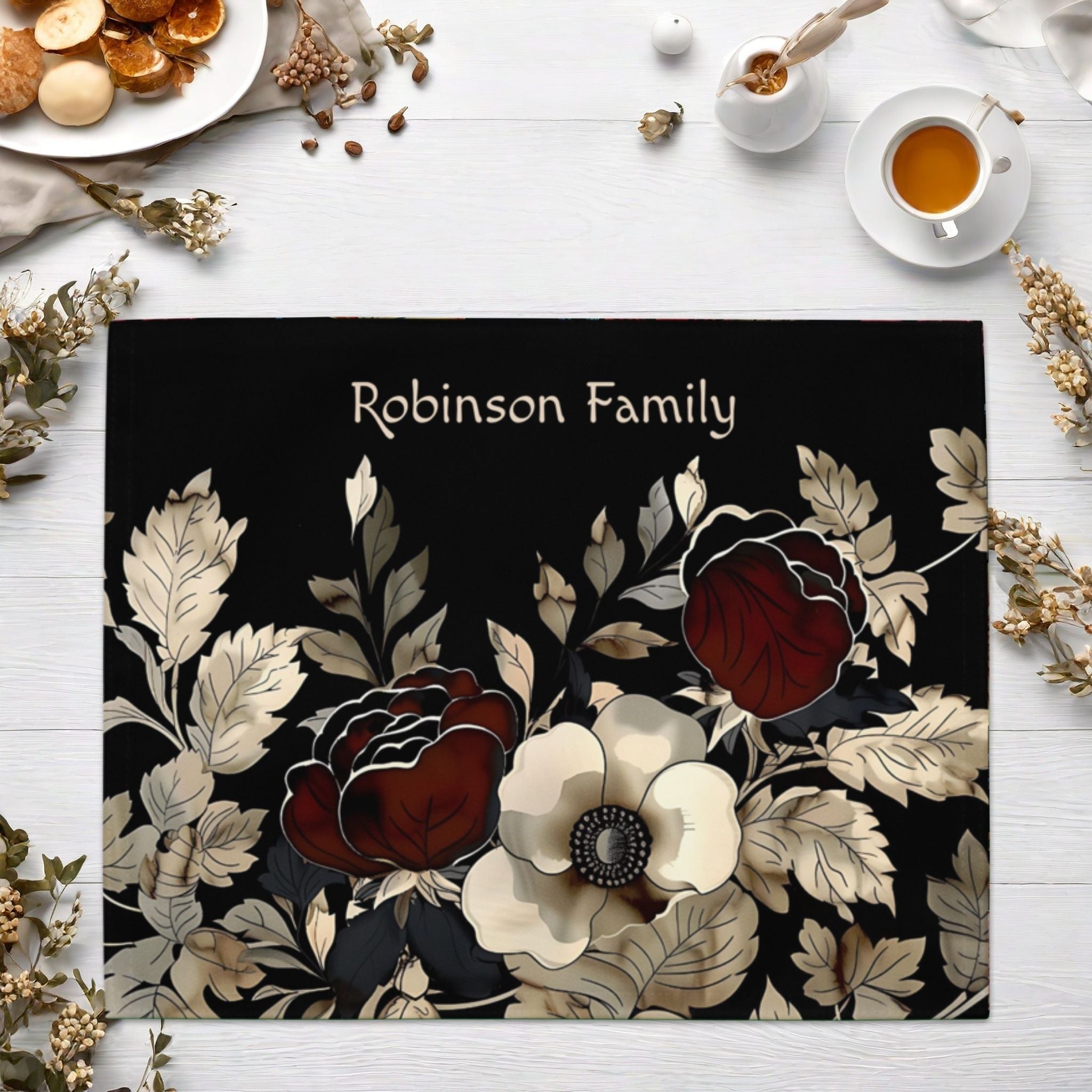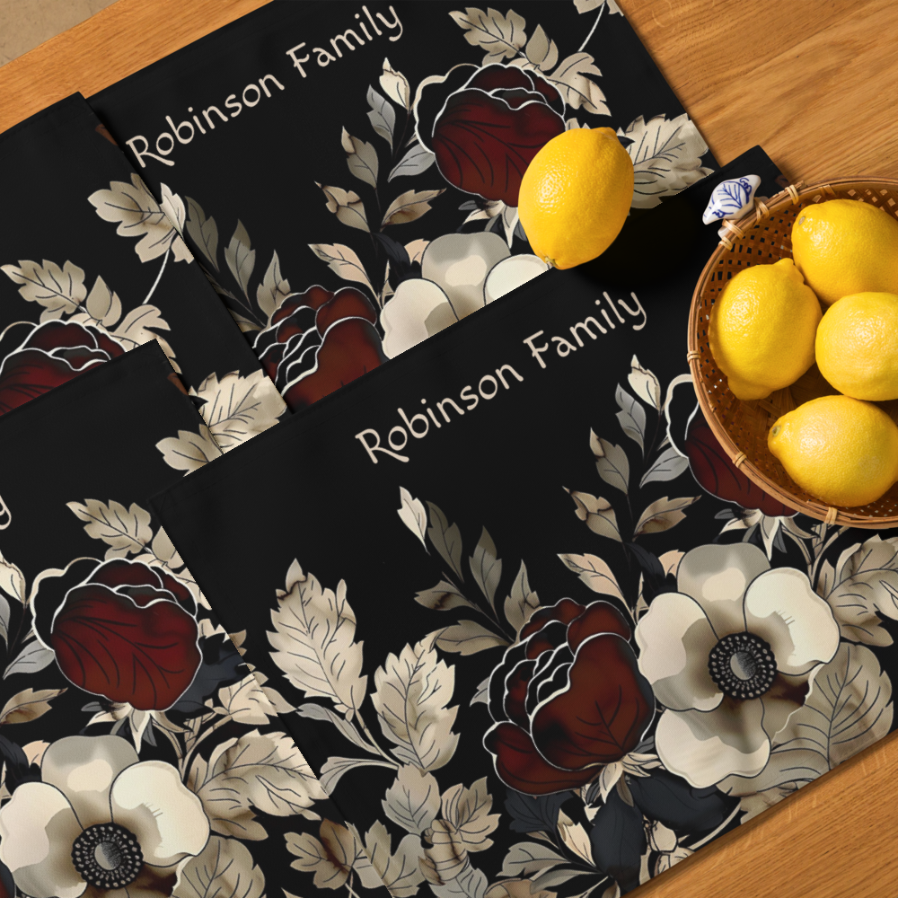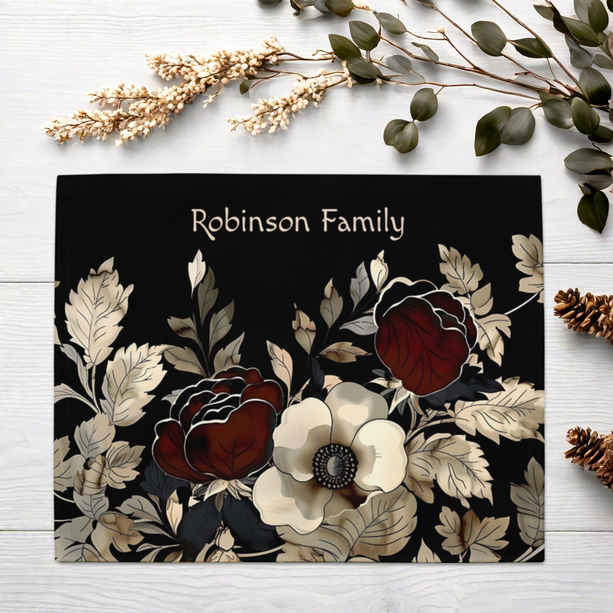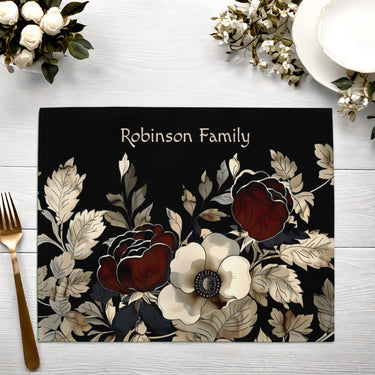 Elevate your dining experience with our exquisite Personalized Floral Placemat Set, designed to infuse your table with a touch of gothic romance and dramatic elegance. This stunning set of four placemats features a captivating dark floral arrangement of deep crimson and cream flowers with shimmering gold and silver leaves, all set against a rich black background. Crowned with your custom family name, these placemats are more than just table linens; they're a unique piece of artistic home decor and a cherished family heirloom.