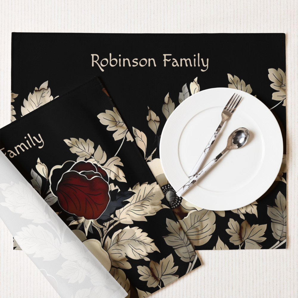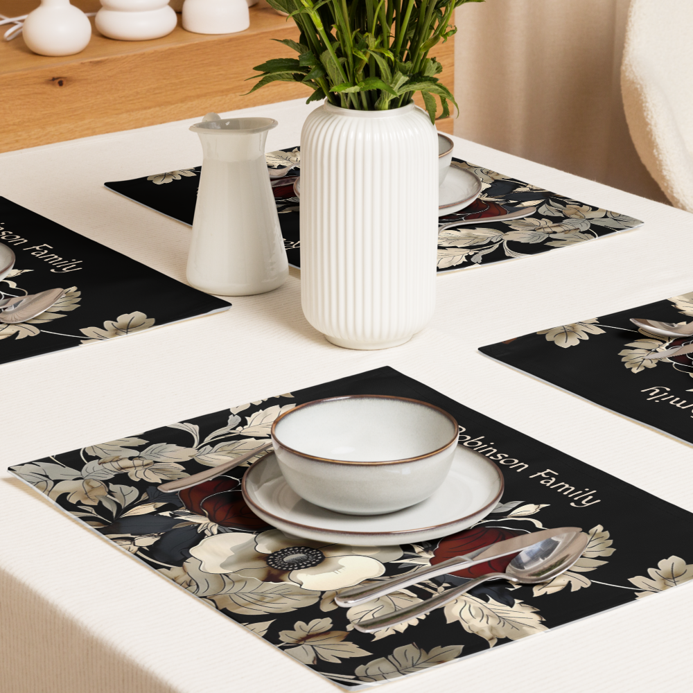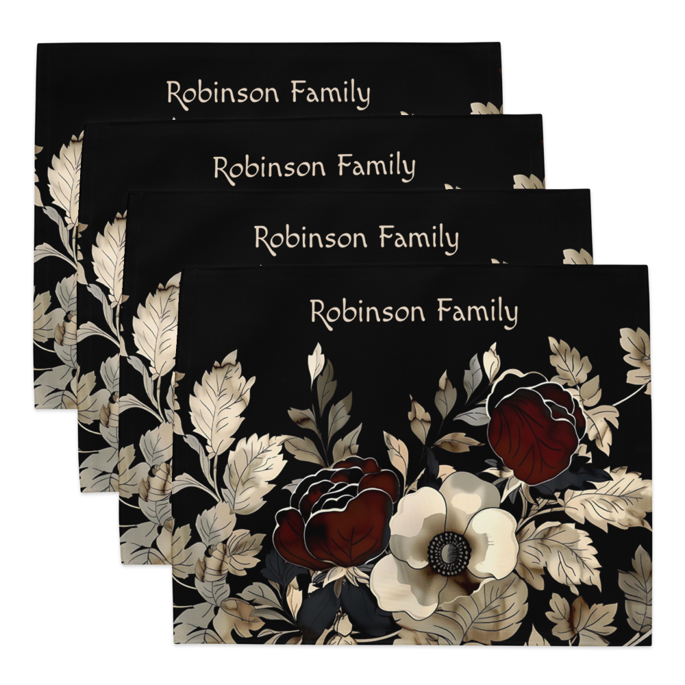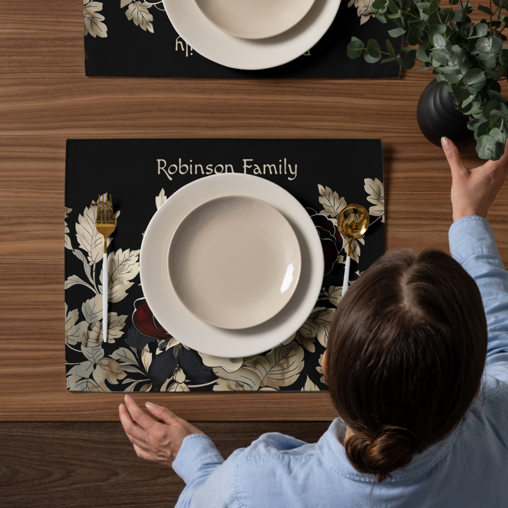 Elevate your dining experience with our exquisite Personalized Floral Placemat Set, designed to infuse your table with a touch of gothic romance and dramatic elegance. This stunning set of four placemats features a captivating dark floral arrangement of deep crimson and cream flowers with shimmering gold and silver leaves, all set against a rich black background. Crowned with your custom family name, these placemats are more than just table linens; they're a unique piece of artistic home decor and a cherished family heirloom.