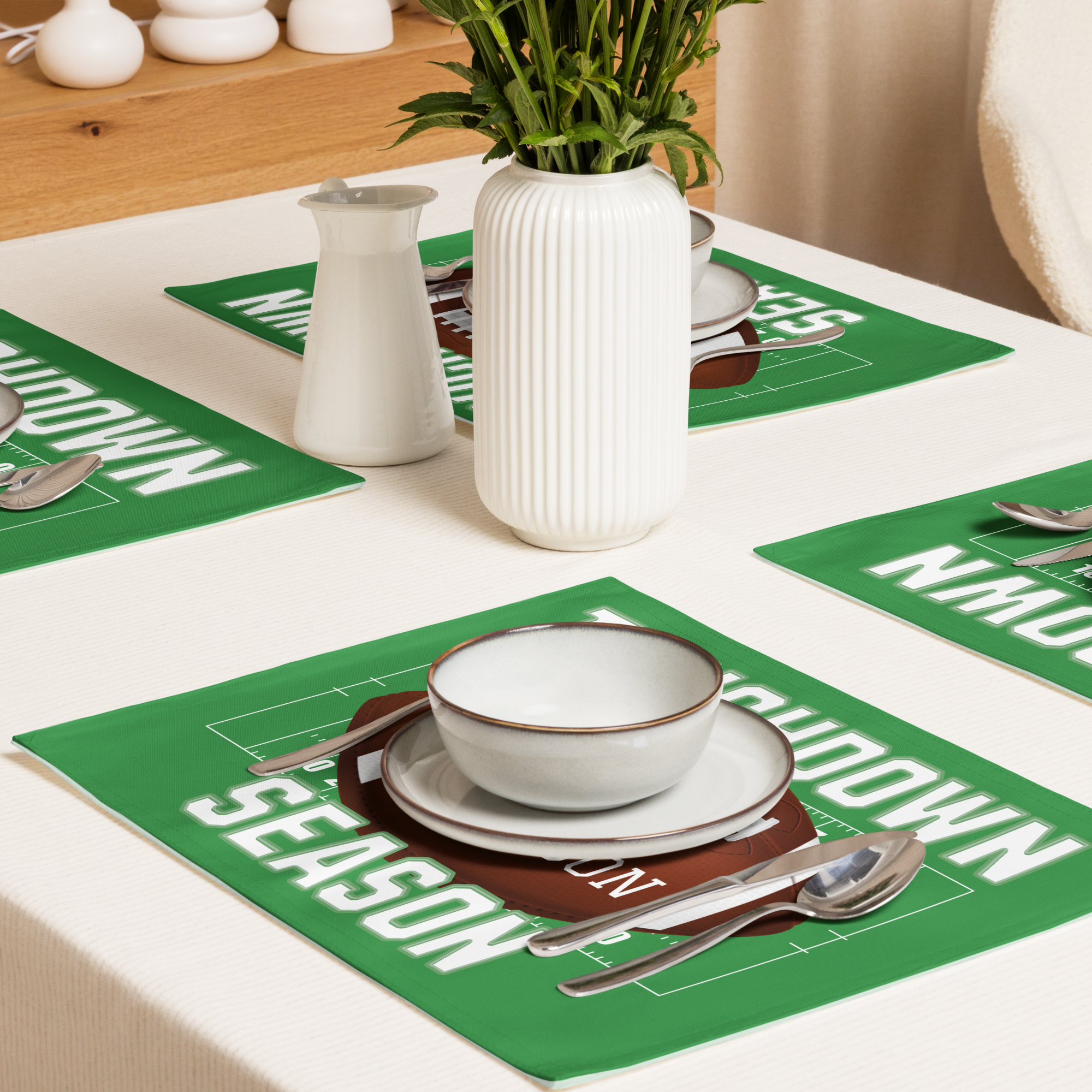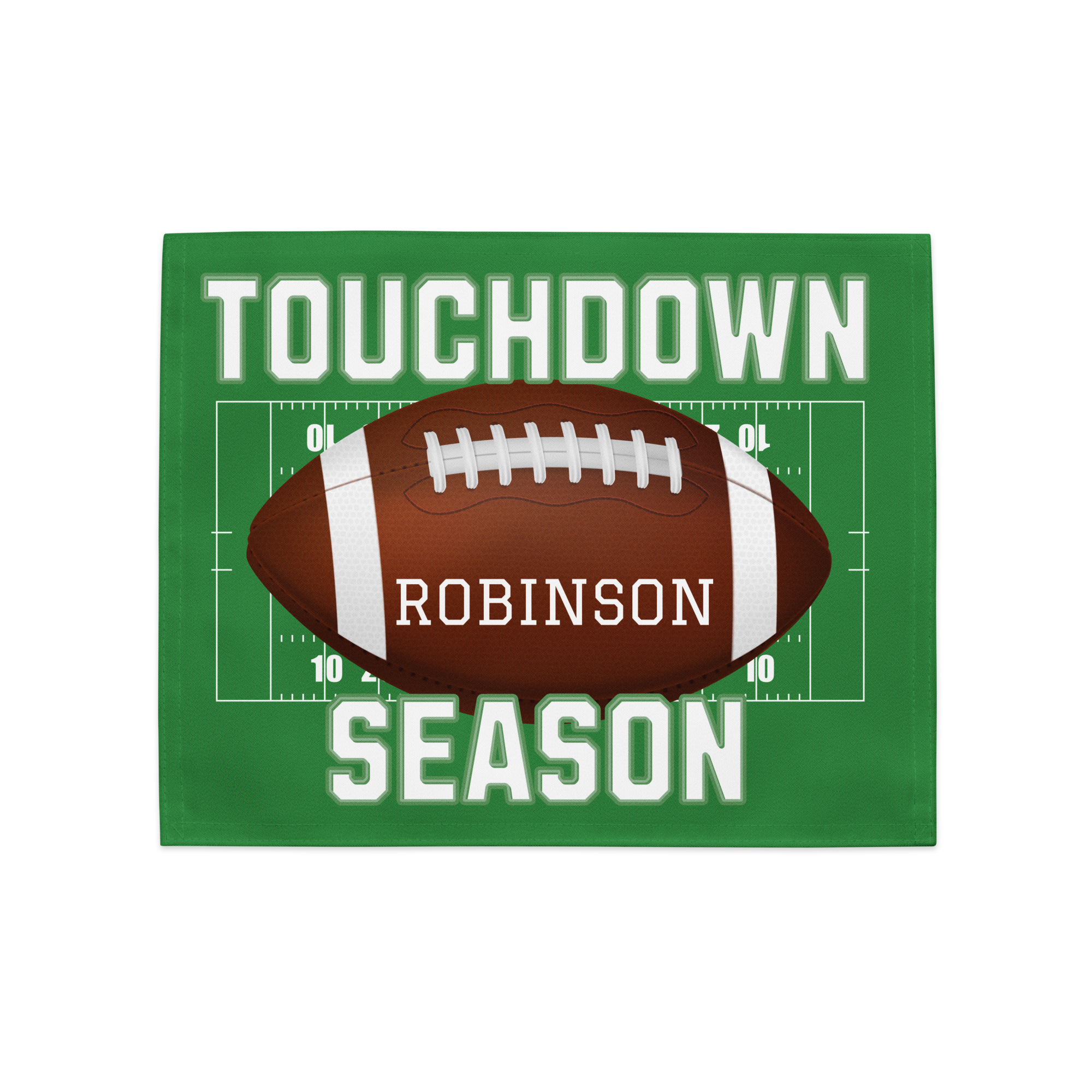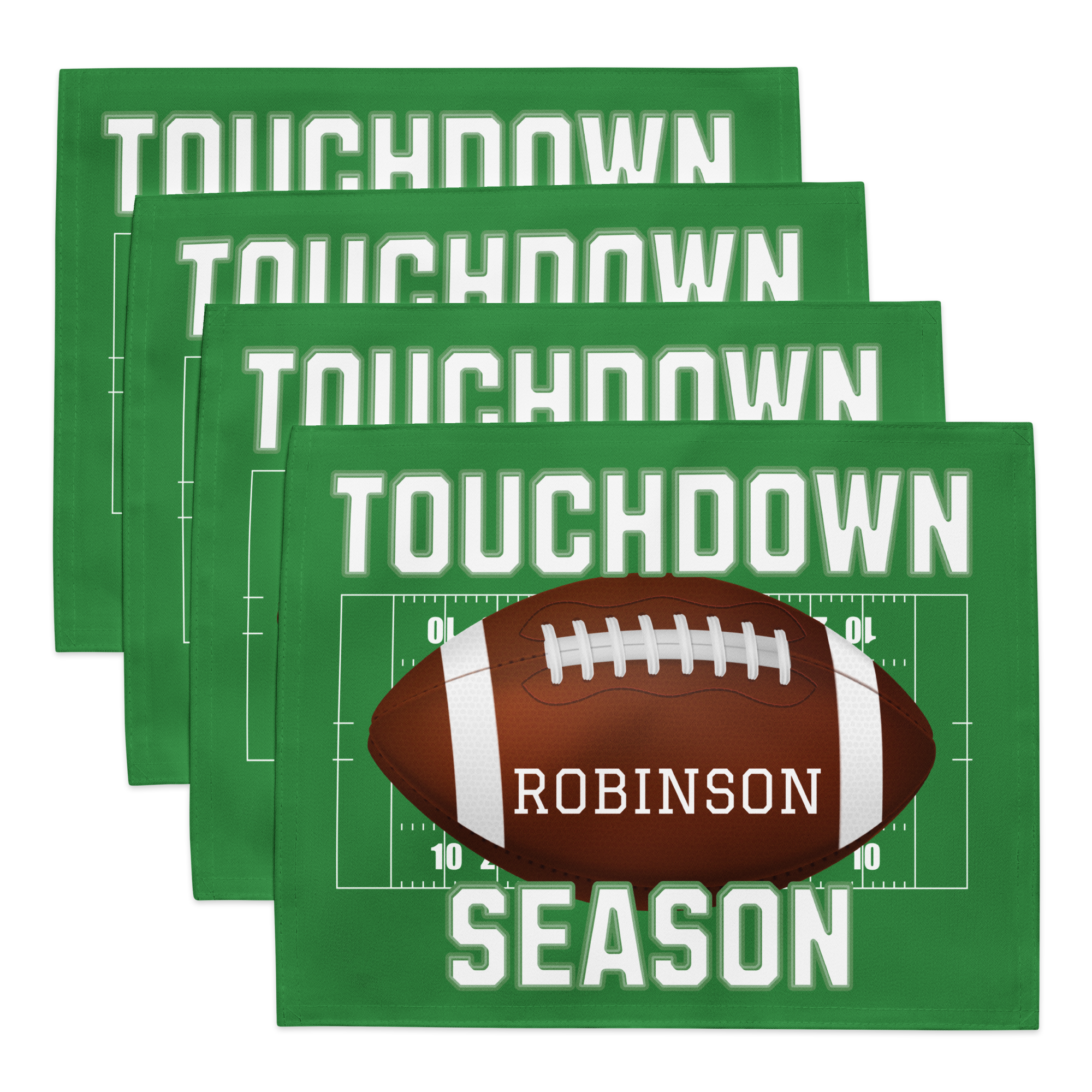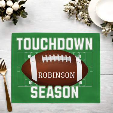 Get ready for your next tailgate, game day party, or team banquet with our vibrant Personalized Football Placemat Set. This coordinated set of four placemats instantly transforms any table into a lively football field, making it the ultimate Game Day Table Decor accessory. Each placemat can be personalized with a different name (up to four names!), creating a fun and memorable touch. Crafted from durable, two-ply 100% Polyester Broadcloth, these 18" x 14" placemats are built to handle spills and high-traffic events. Perfect as a thoughtful Coach Gift, a unique Sports Fan Gift, or a winning accent for your own home, this customizable placemat set brings the spirit of the game right to your table—a true touchdown in table linens!