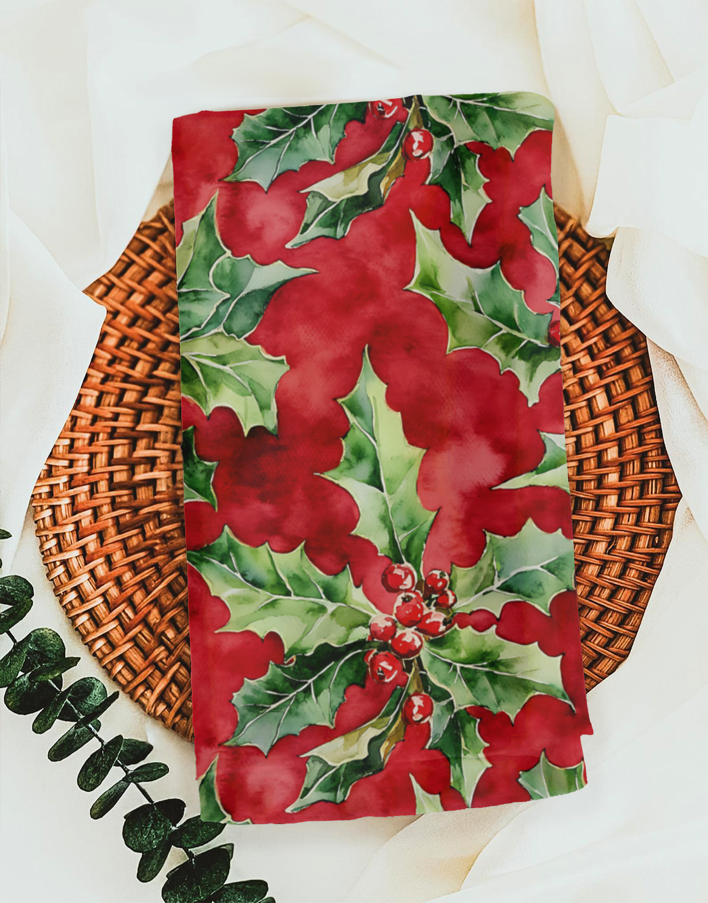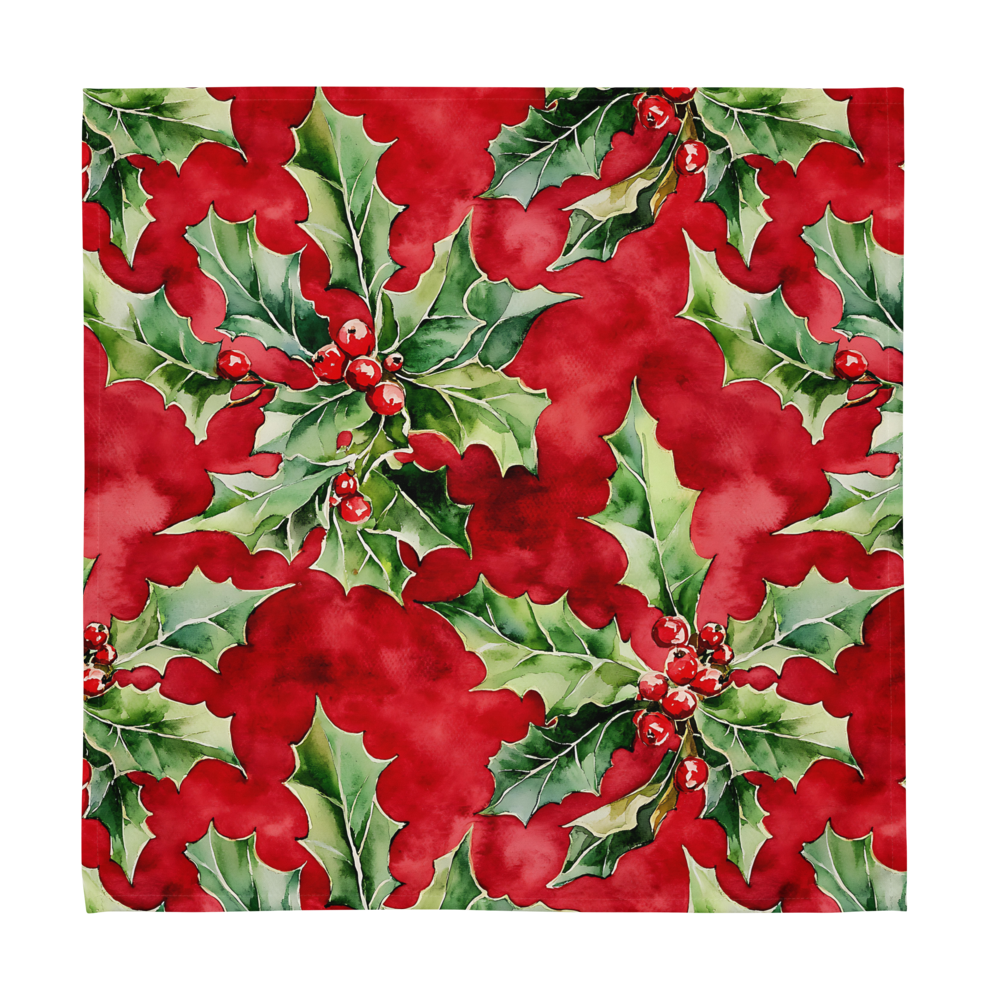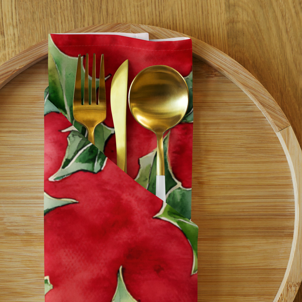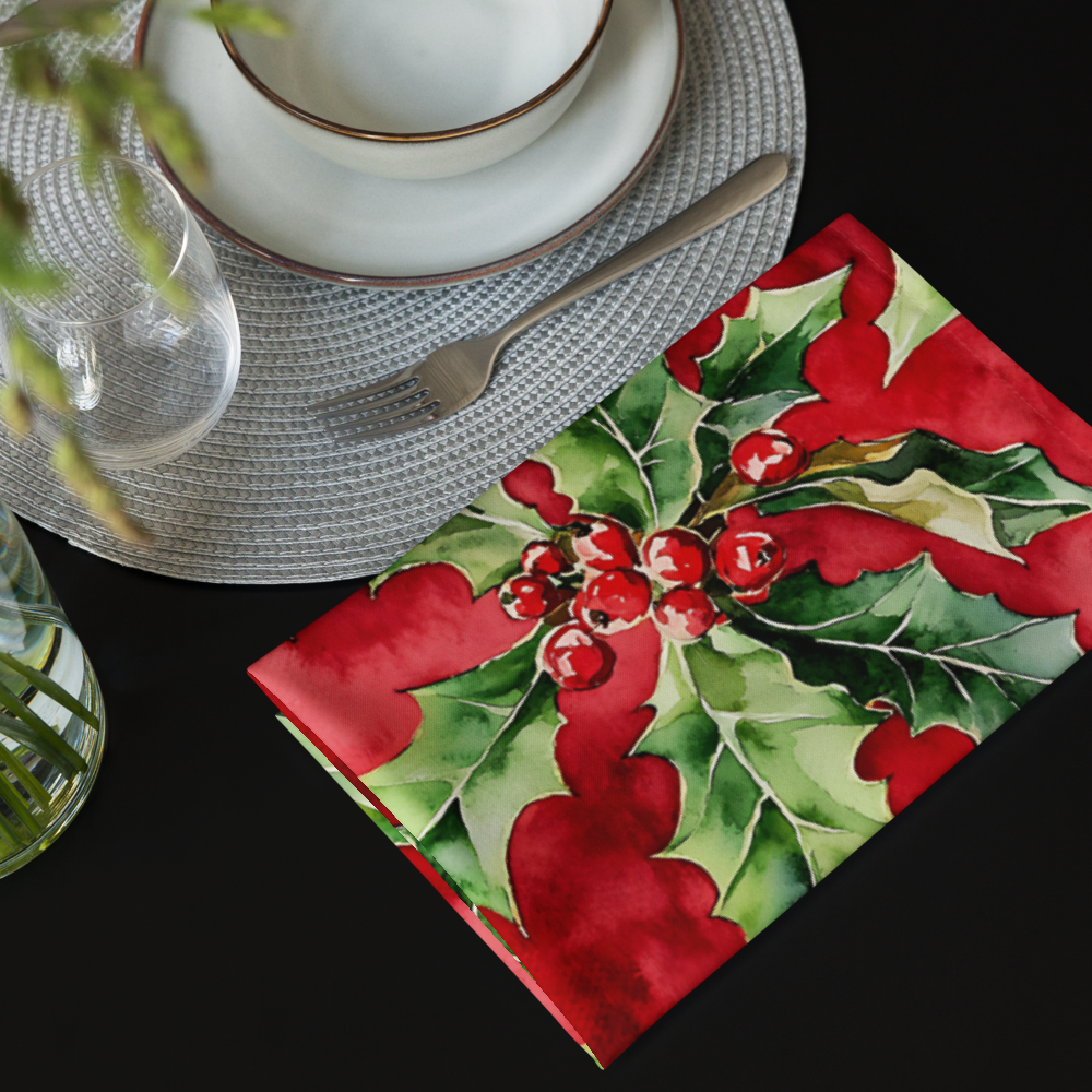 Set the scene for your holiday feasts with this vibrant Set of 4 Watercolor Holly Berry Napkins, the essential accent for Christmas table decor. Crafted from soft and durable 100% polyester broadcloth, each large (20"x20") napkin features a stunning, repeating pattern of classic holly leaves and festive red berries over a rich red background. Finished with polished hemmed edges, this napkin set brings instant Christmas cheer and elegant style to your holiday dinner parties, family gatherings, or any seasonal meal. This durable set of seasonal cloth napkins is a wonderful way for families to make their dining space festive and makes a lovely hostess gift.