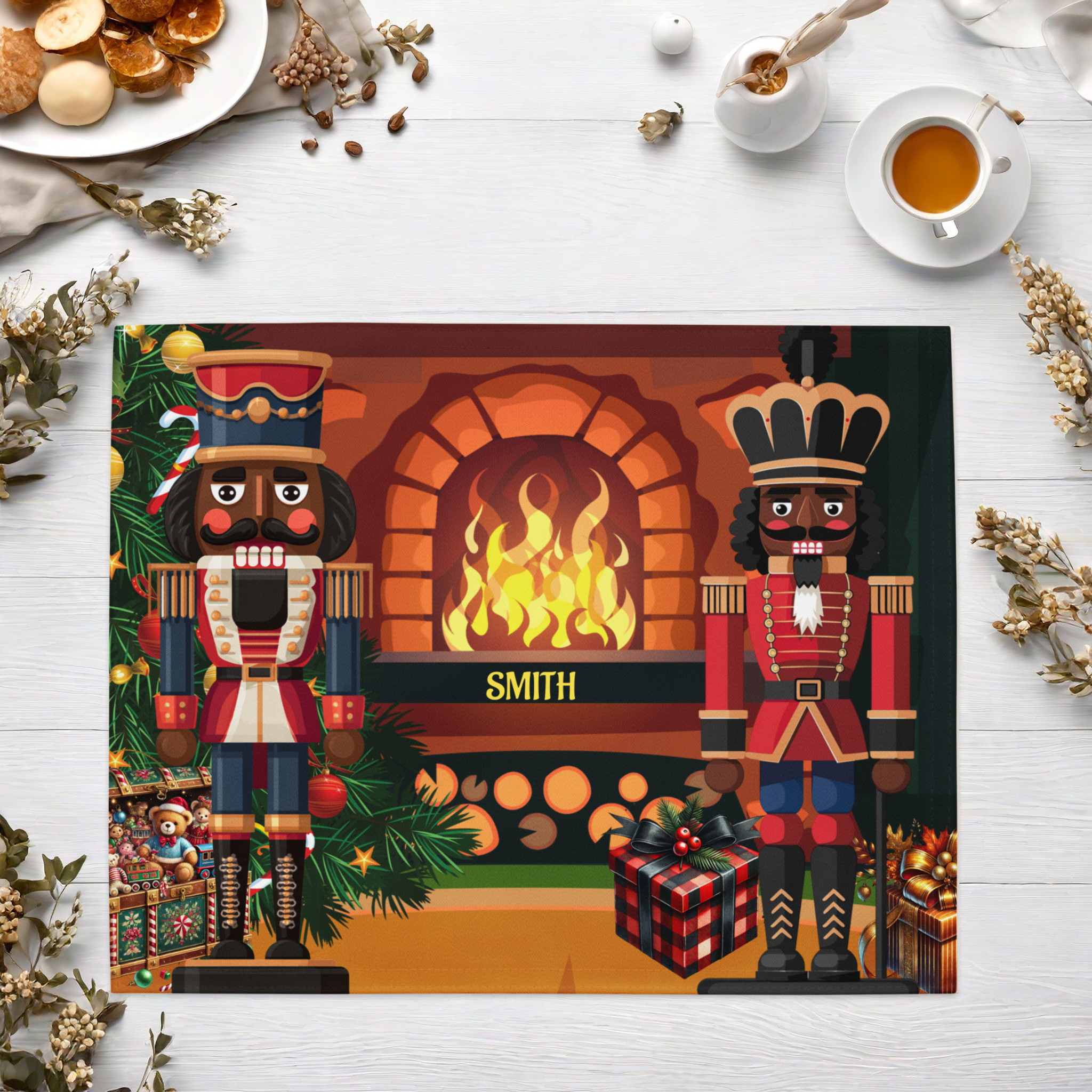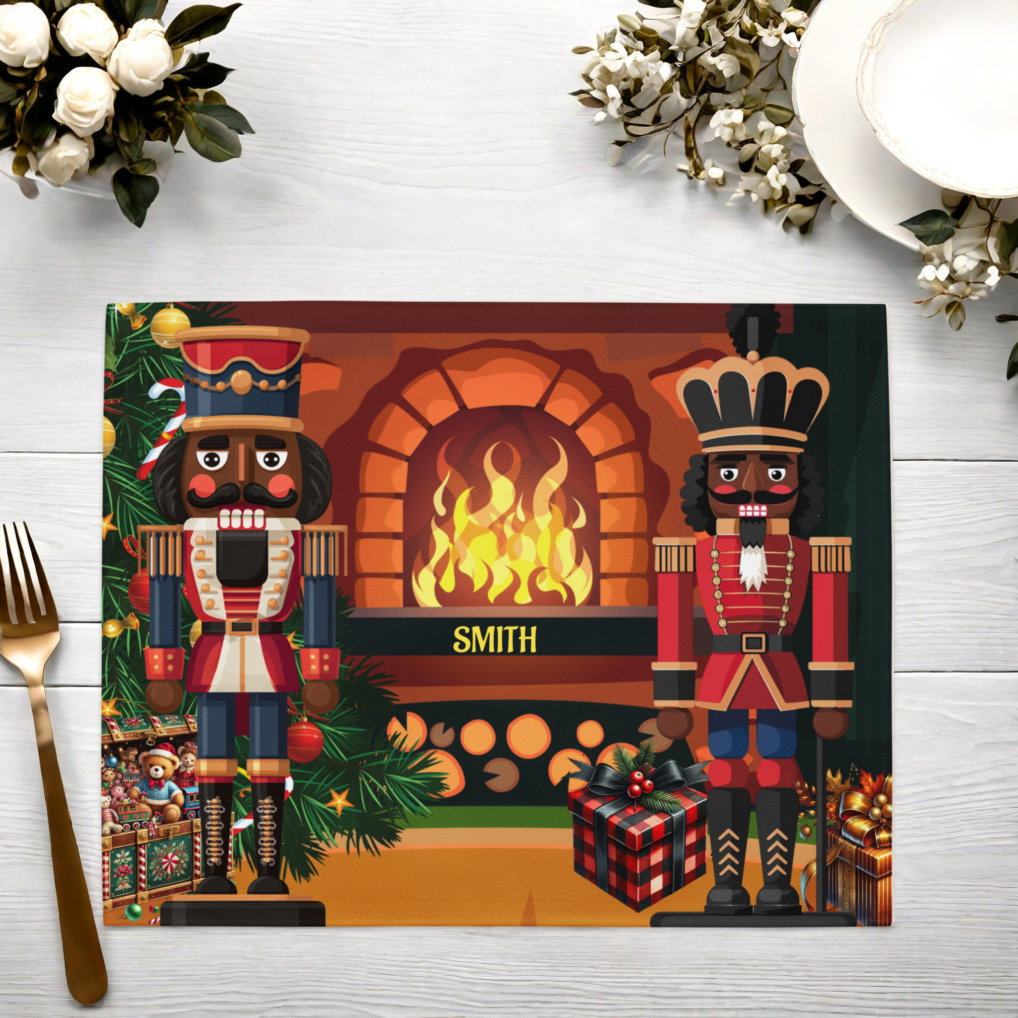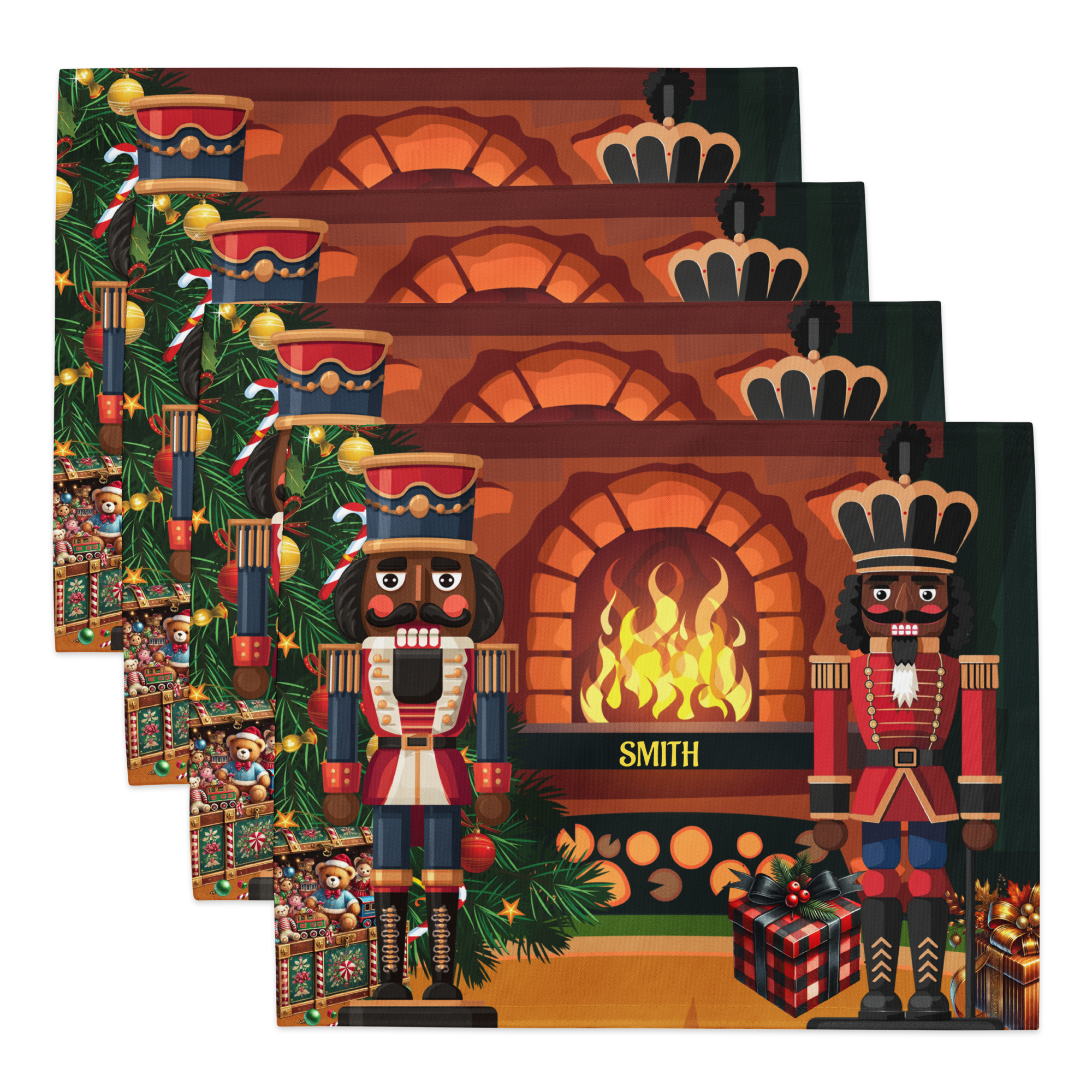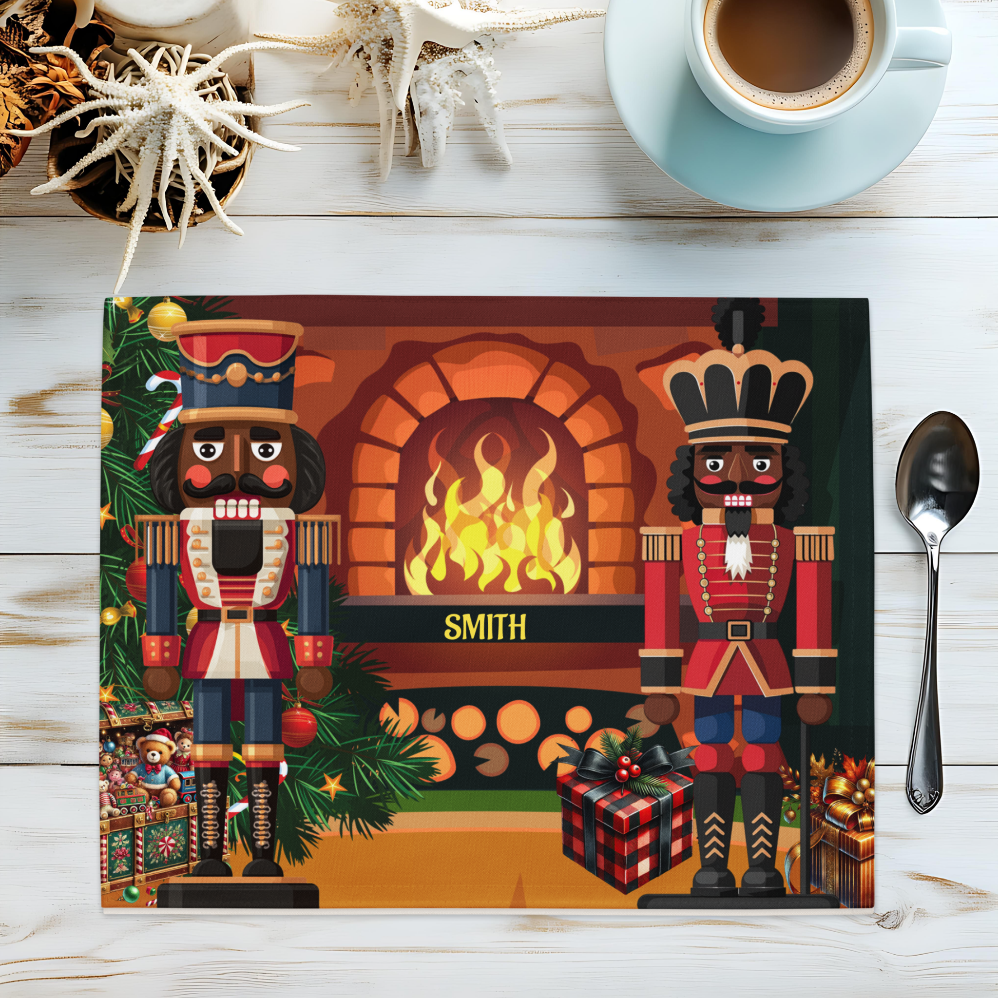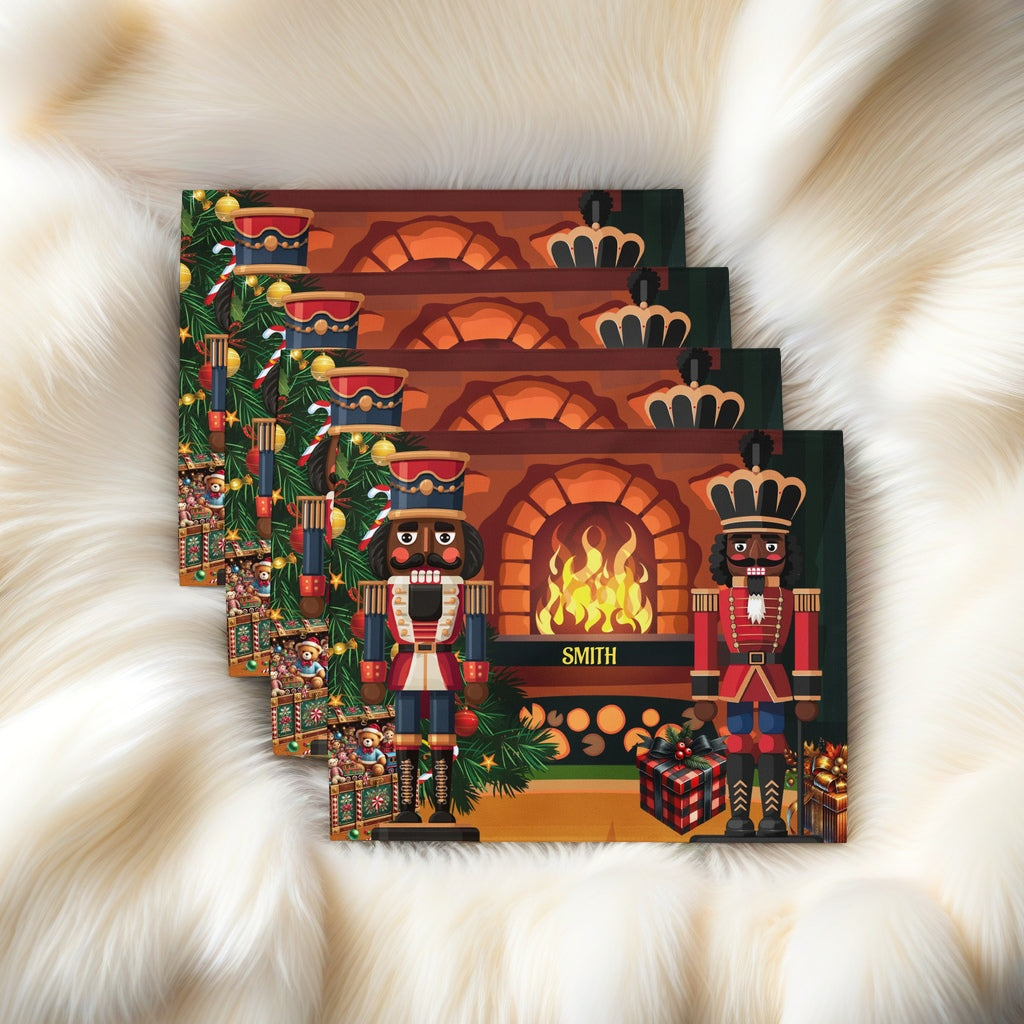 Bring holiday elegance and cultural pride to your table with our Black Nutcracker 4-Piece Christmas Placemat Set, featuring two regal nutcracker soldiers standing before a glowing fireplace surrounded by festive décor. This vibrant and sophisticated design celebrates diversity while adding timeless Christmas charm to your holiday table setting. Personalized with your family name, these placemats make every meal feel extra special.