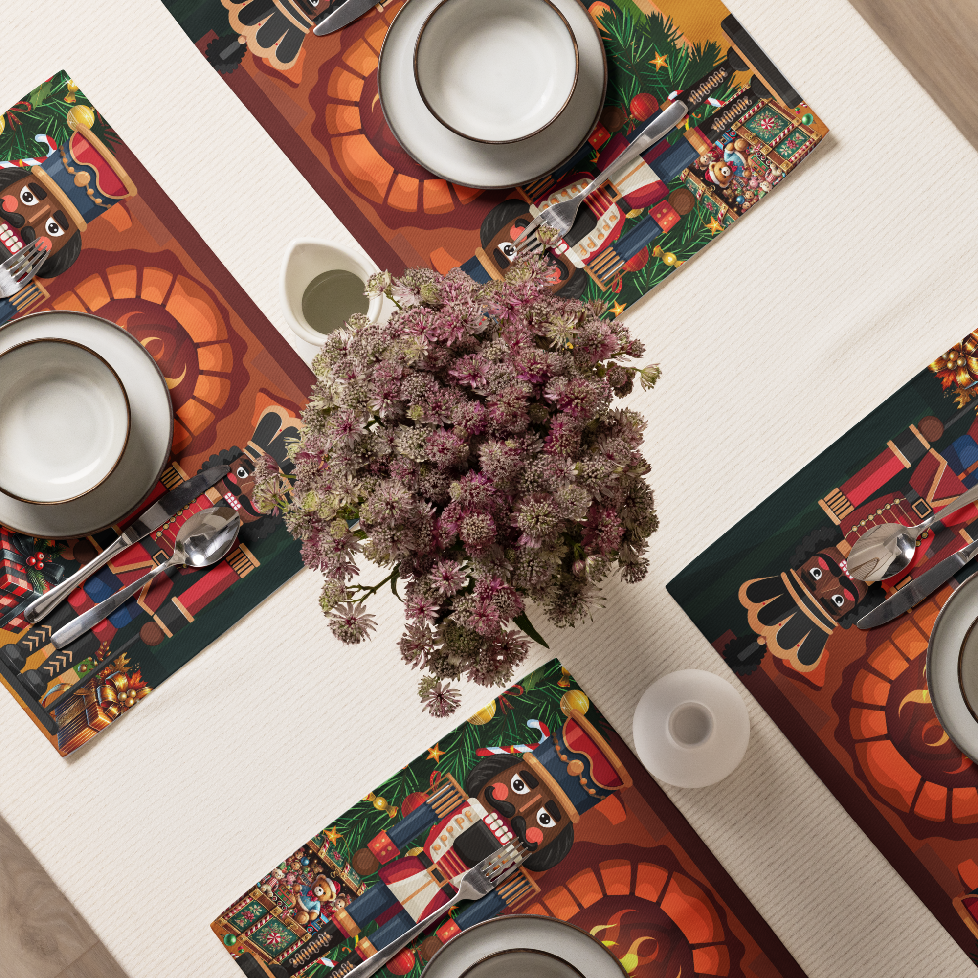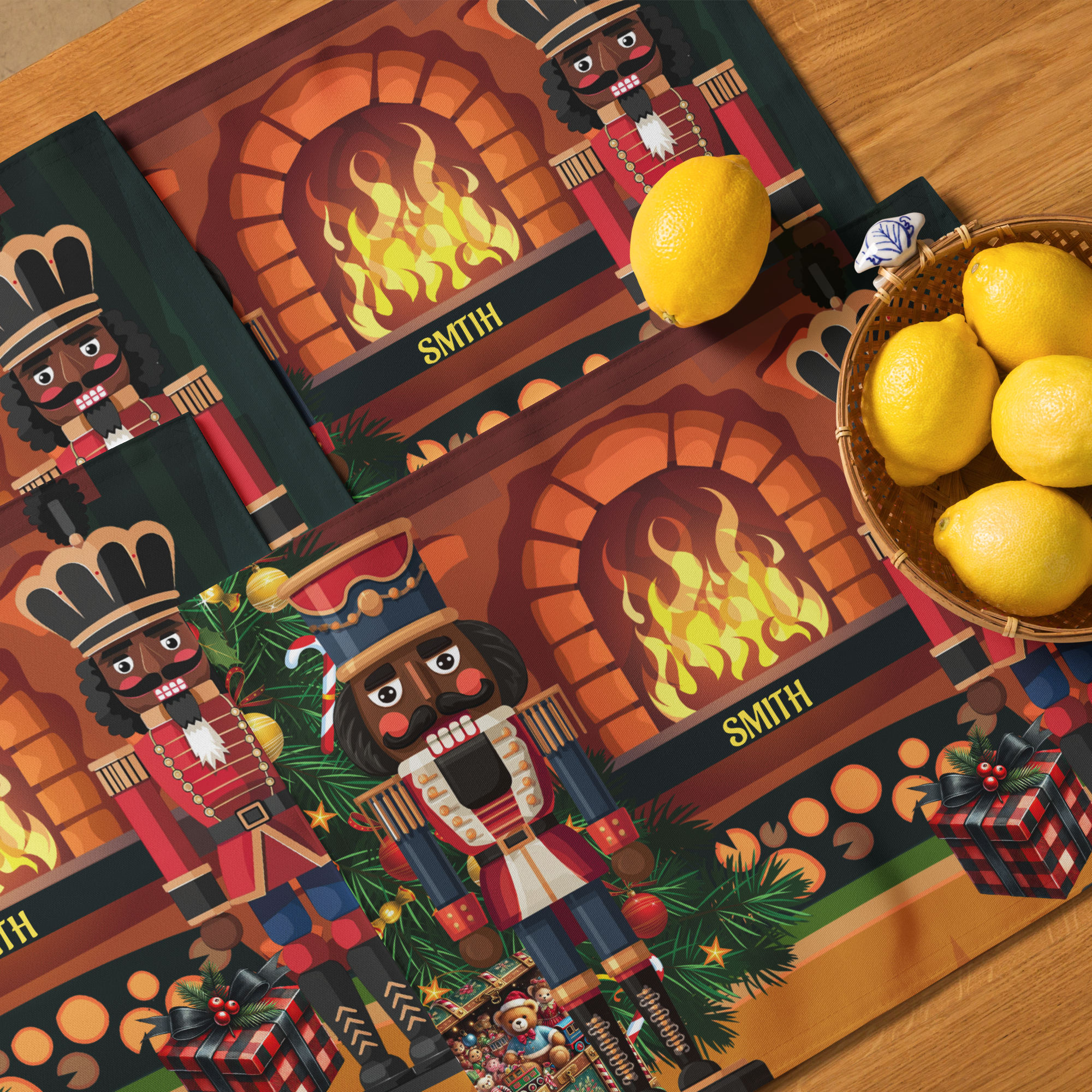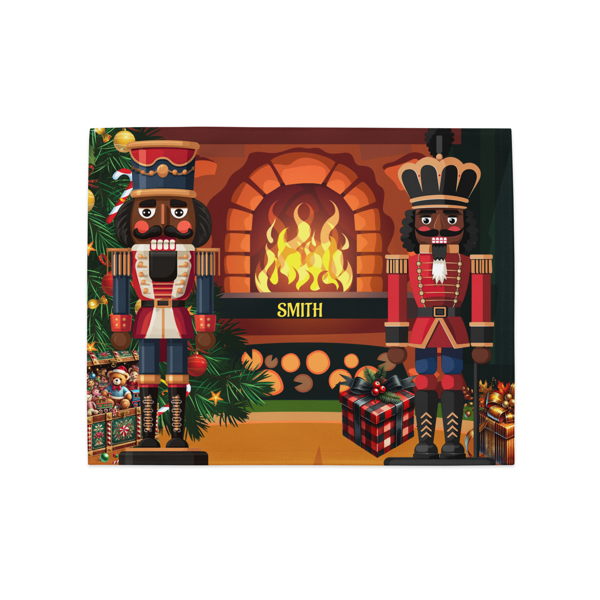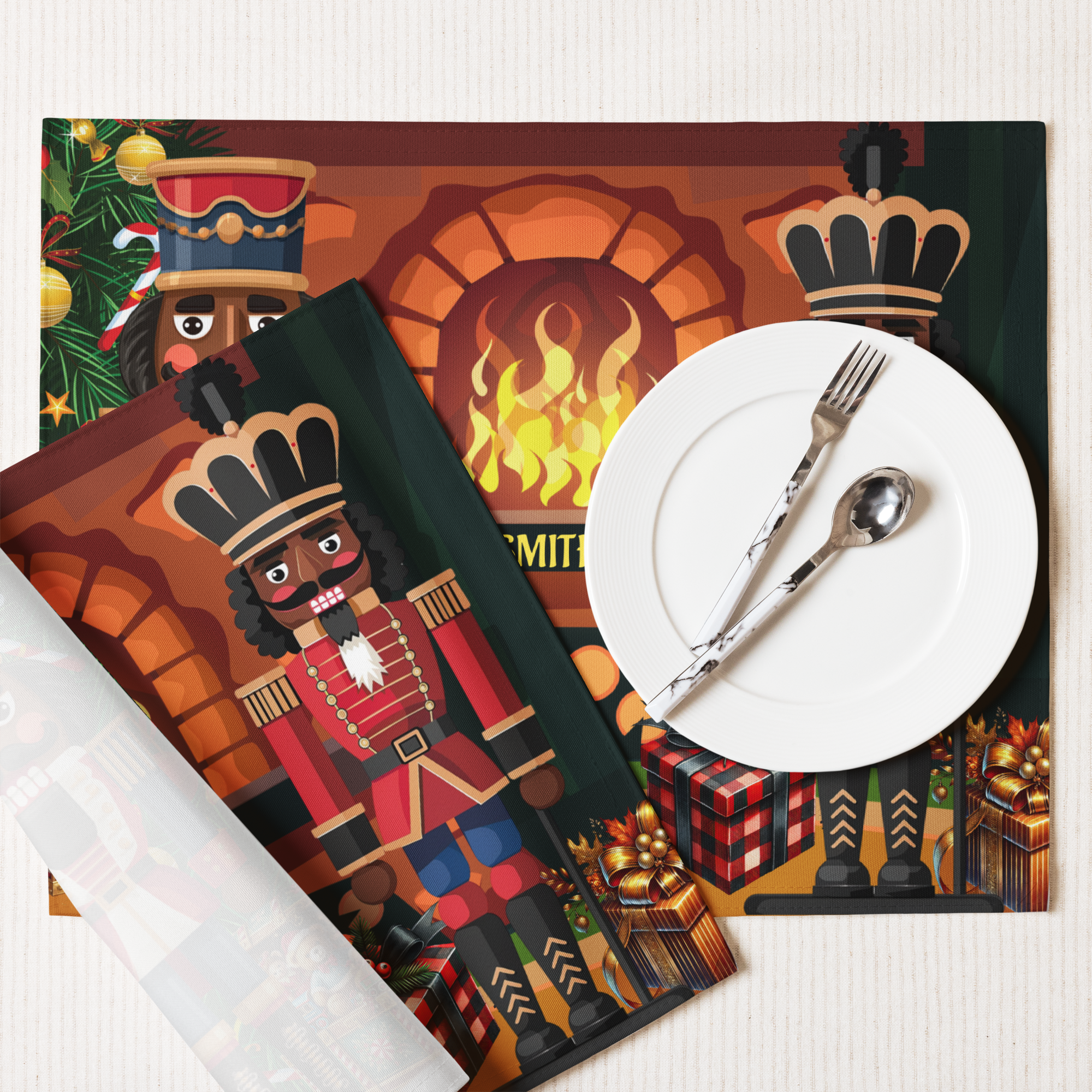 Bring holiday elegance and cultural pride to your table with our Black Nutcracker 4-Piece Christmas Placemat Set, featuring two regal nutcracker soldiers standing before a glowing fireplace surrounded by festive décor. This vibrant and sophisticated design celebrates diversity while adding timeless Christmas charm to your holiday table setting. Personalized with your family name, these placemats make every meal feel extra special.