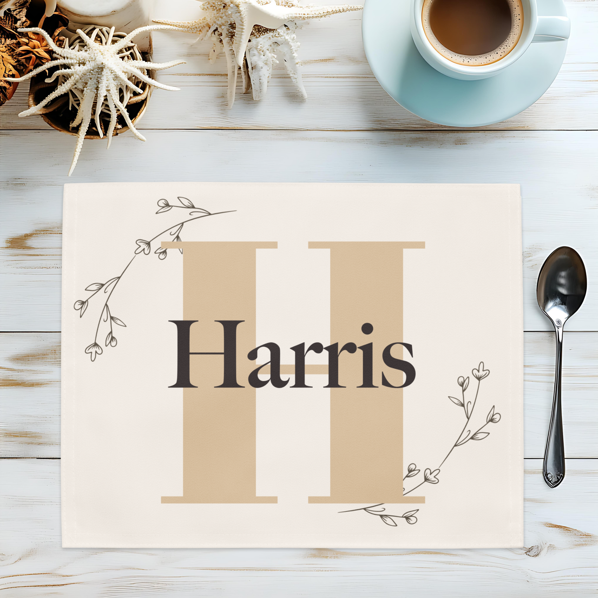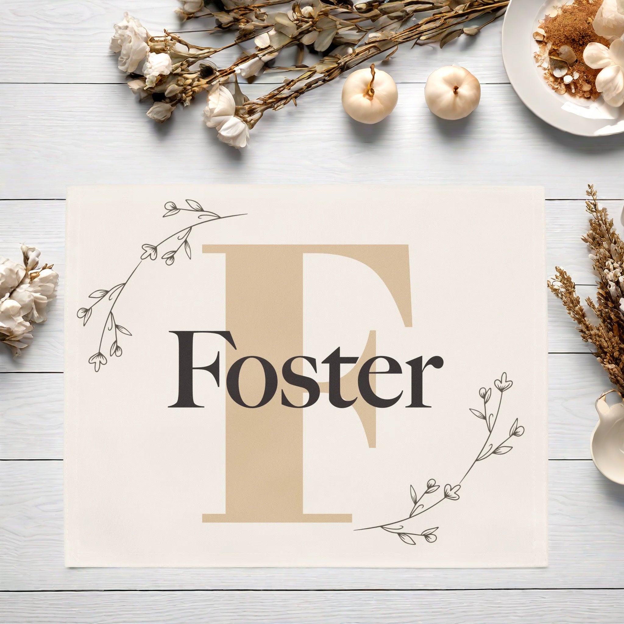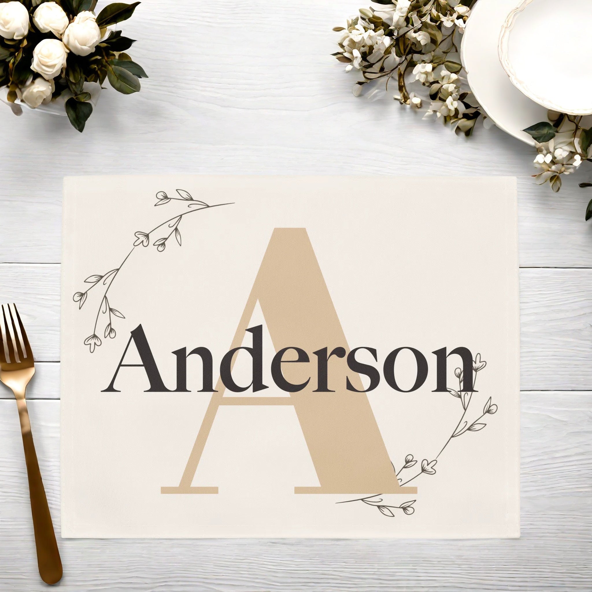 Elevate every meal with our Personalized Name Placemat Set, a timeless addition to your dining table that blends elegance with everyday function. This set of 4 custom placemats features a beautifully designed large initial and personalized name, framed by delicate botanical line art - perfect for adding a bespoke touch to your modern farmhouse, rustic, or classic decor. Crafted from 100% durable polyester broadcloth, each placemat is two-ply for extra durability and finished with neatly hemmed edges for a polished, luxurious look. Ideal as a housewarming gift, wedding present, or family keepsake, these monogrammed placemats turn any table into a personalized dining experience. Generously sized at 18″×14″, they offer both style and practicality for daily meals or special gatherings.