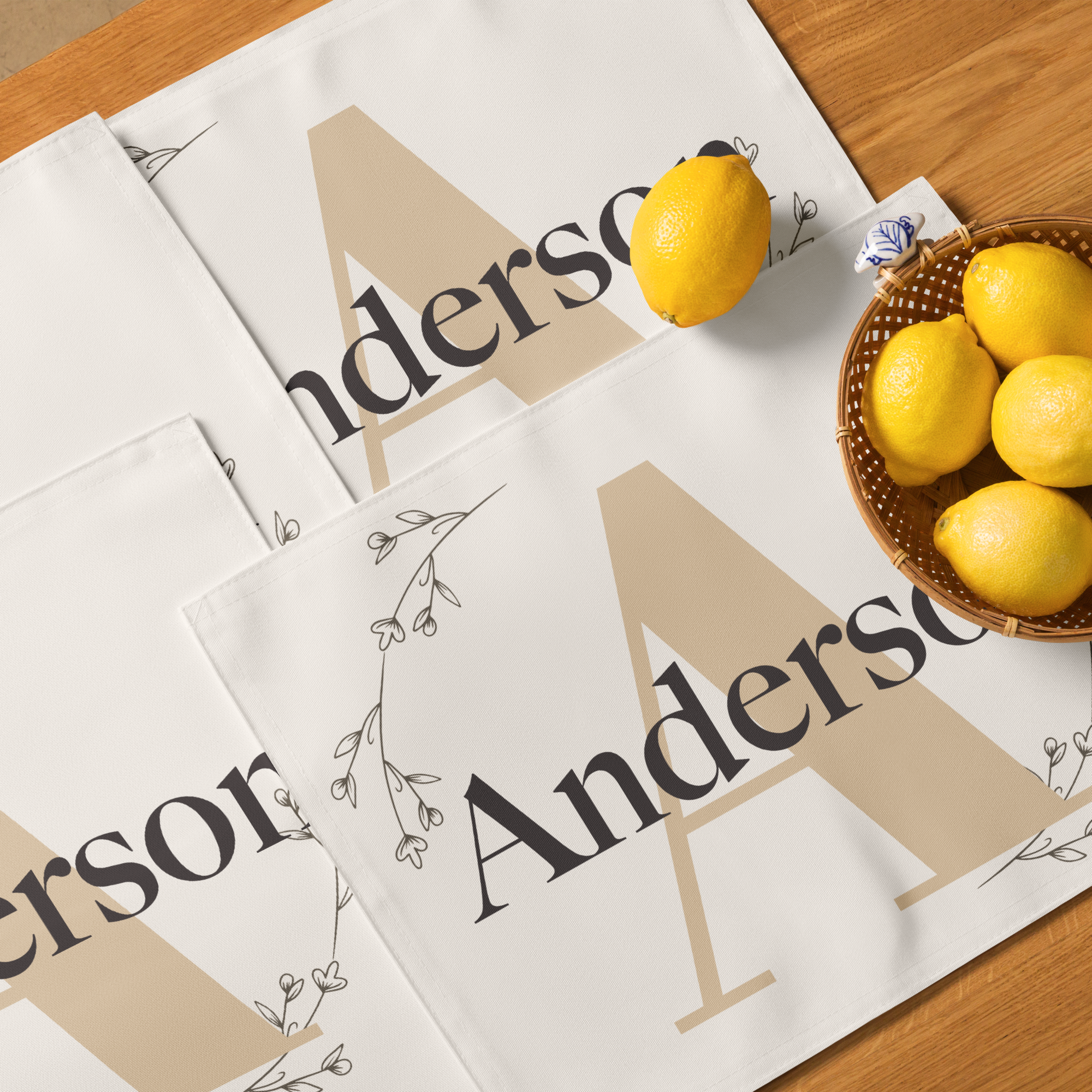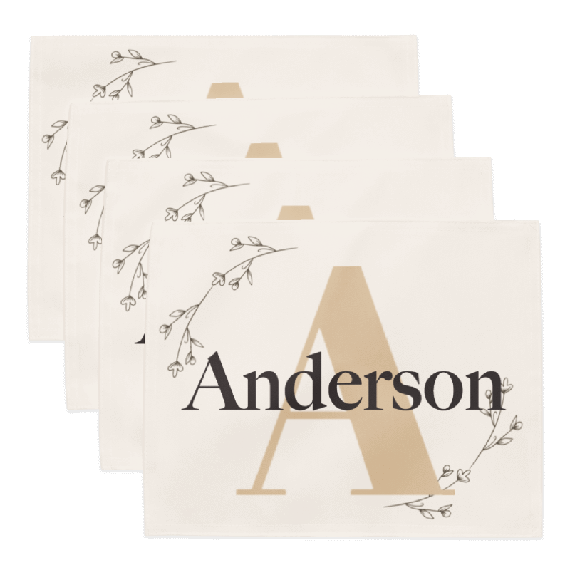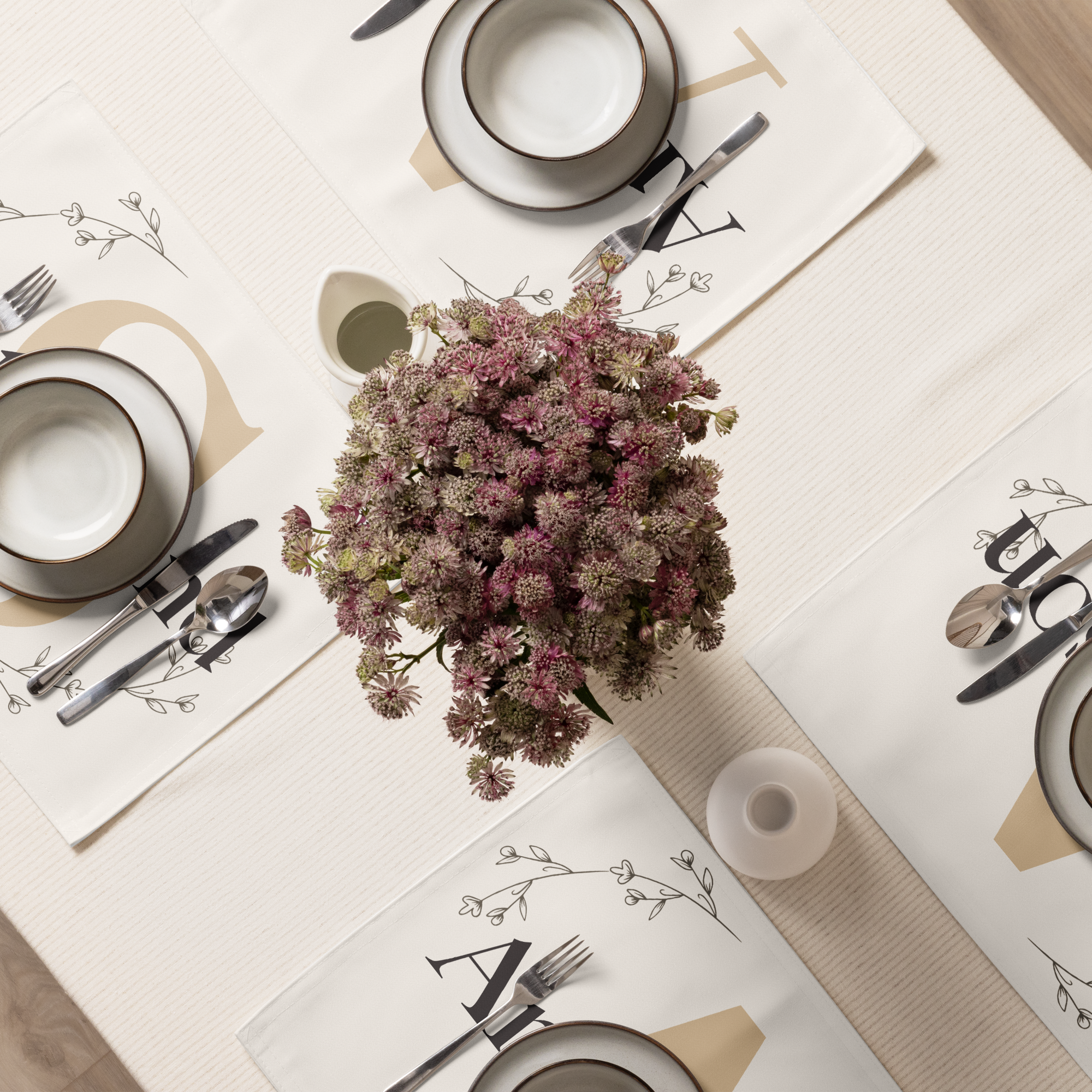 Elevate every meal with our Personalized Name Placemat Set, a timeless addition to your dining table that blends elegance with everyday function. This set of 4 custom placemats features a beautifully designed large initial and personalized name, framed by delicate botanical line art - perfect for adding a bespoke touch to your modern farmhouse, rustic, or classic decor. Crafted from 100% durable polyester broadcloth, each placemat is two-ply for extra durability and finished with neatly hemmed edges for a polished, luxurious look. Ideal as a housewarming gift, wedding present, or family keepsake, these monogrammed placemats turn any table into a personalized dining experience. Generously sized at 18″×14″, they offer both style and practicality for daily meals or special gatherings.