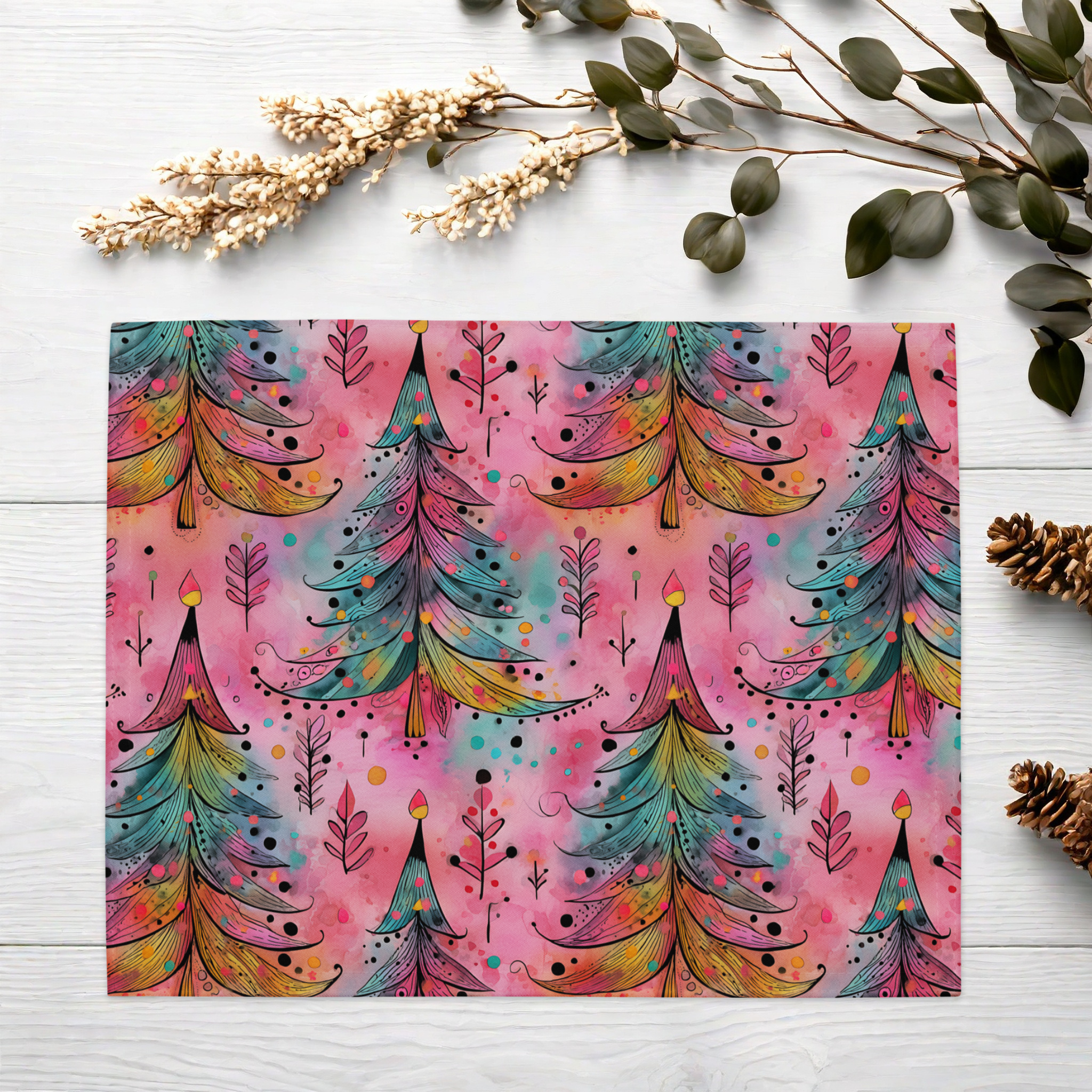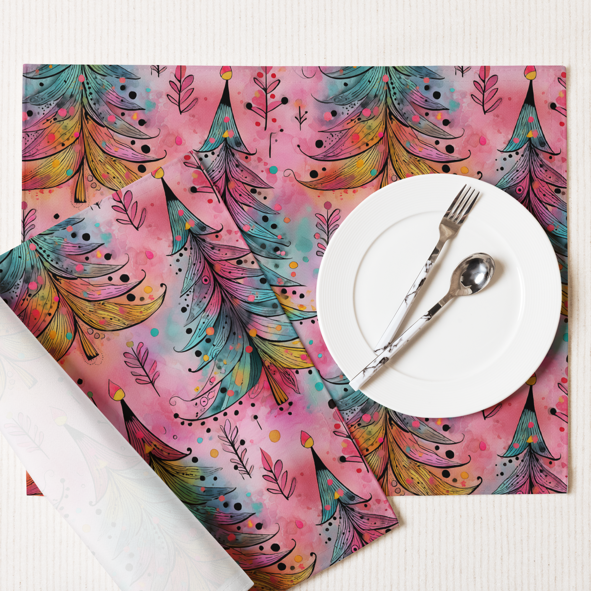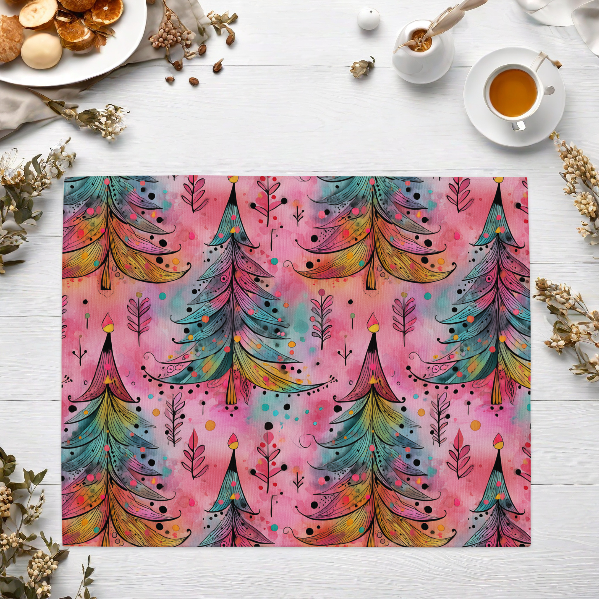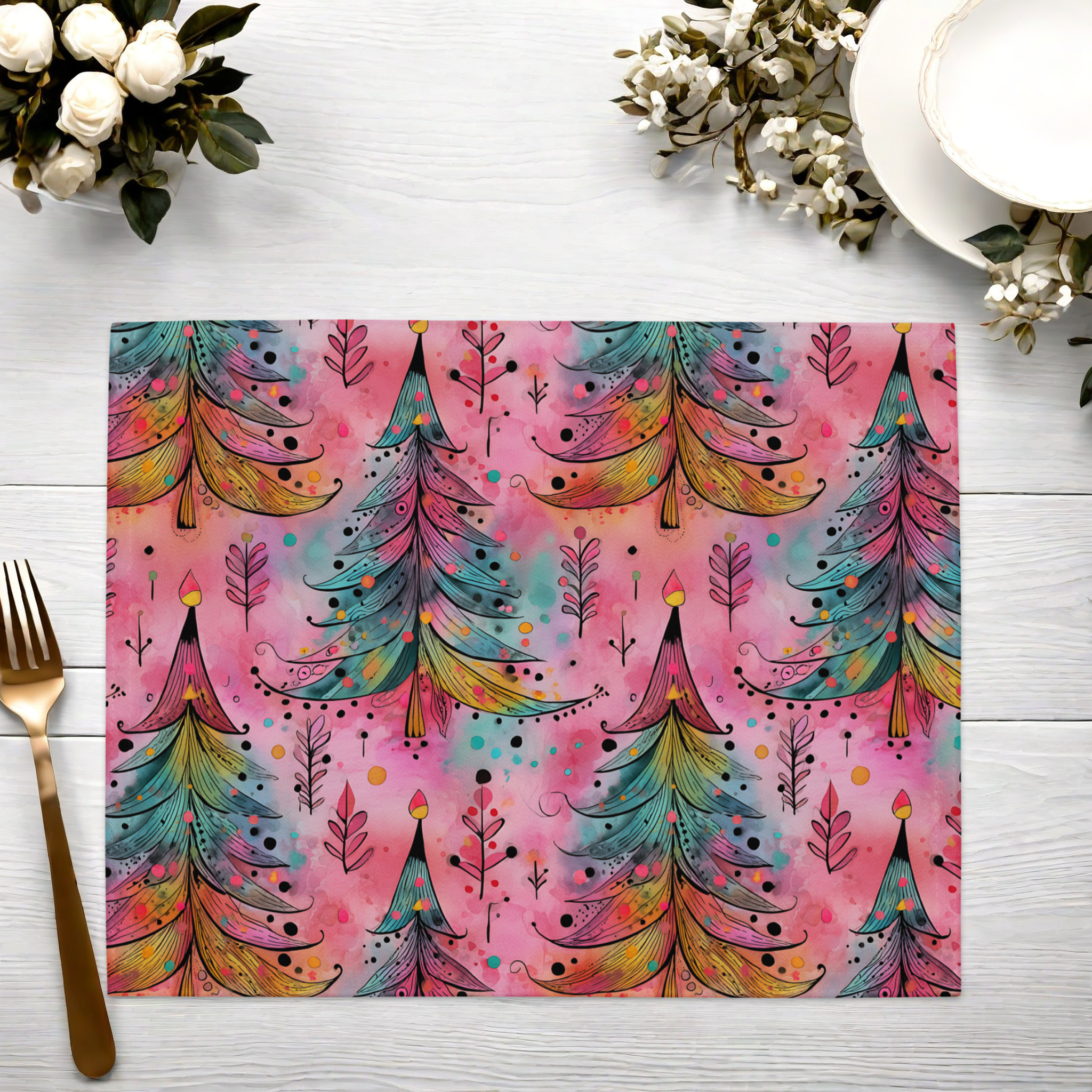 Add vibrant holiday charm to your dining space with this Whimsical Pink Christmas Tree Placemat, featuring a stunning watercolor-style pattern in bright rainbow hues. Perfect for Christmas dinners, winter parties, and modern holiday décor. Its smooth, refined texture and eye-catching artistic design make it an effortless way to elevate your seasonal table setting.