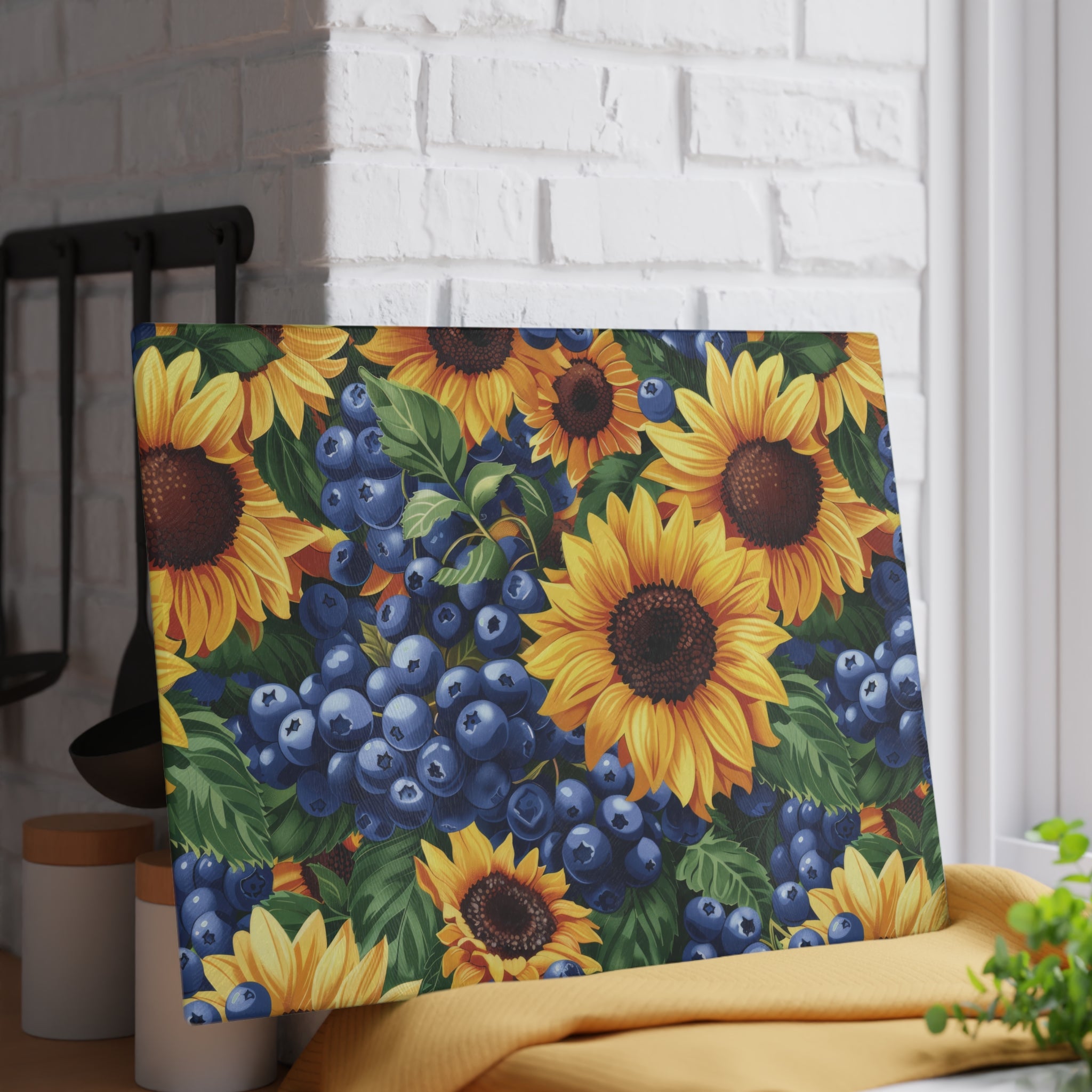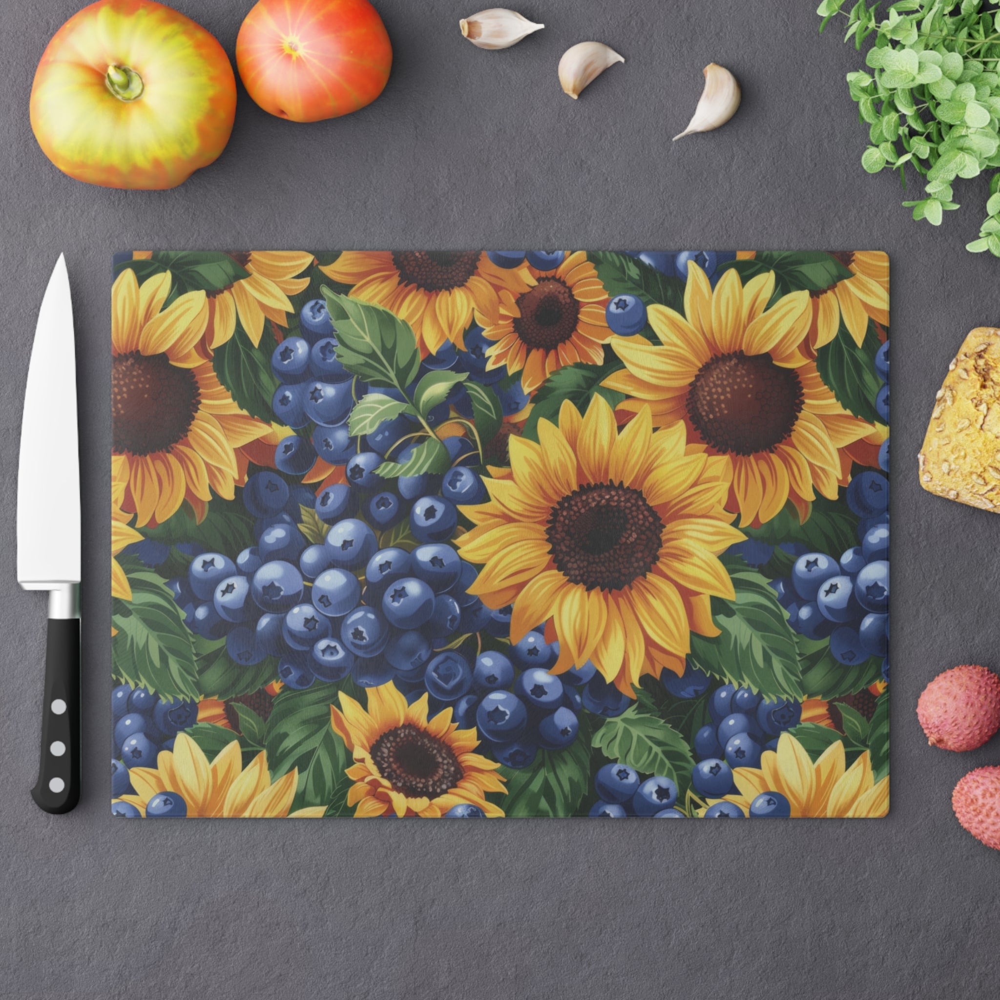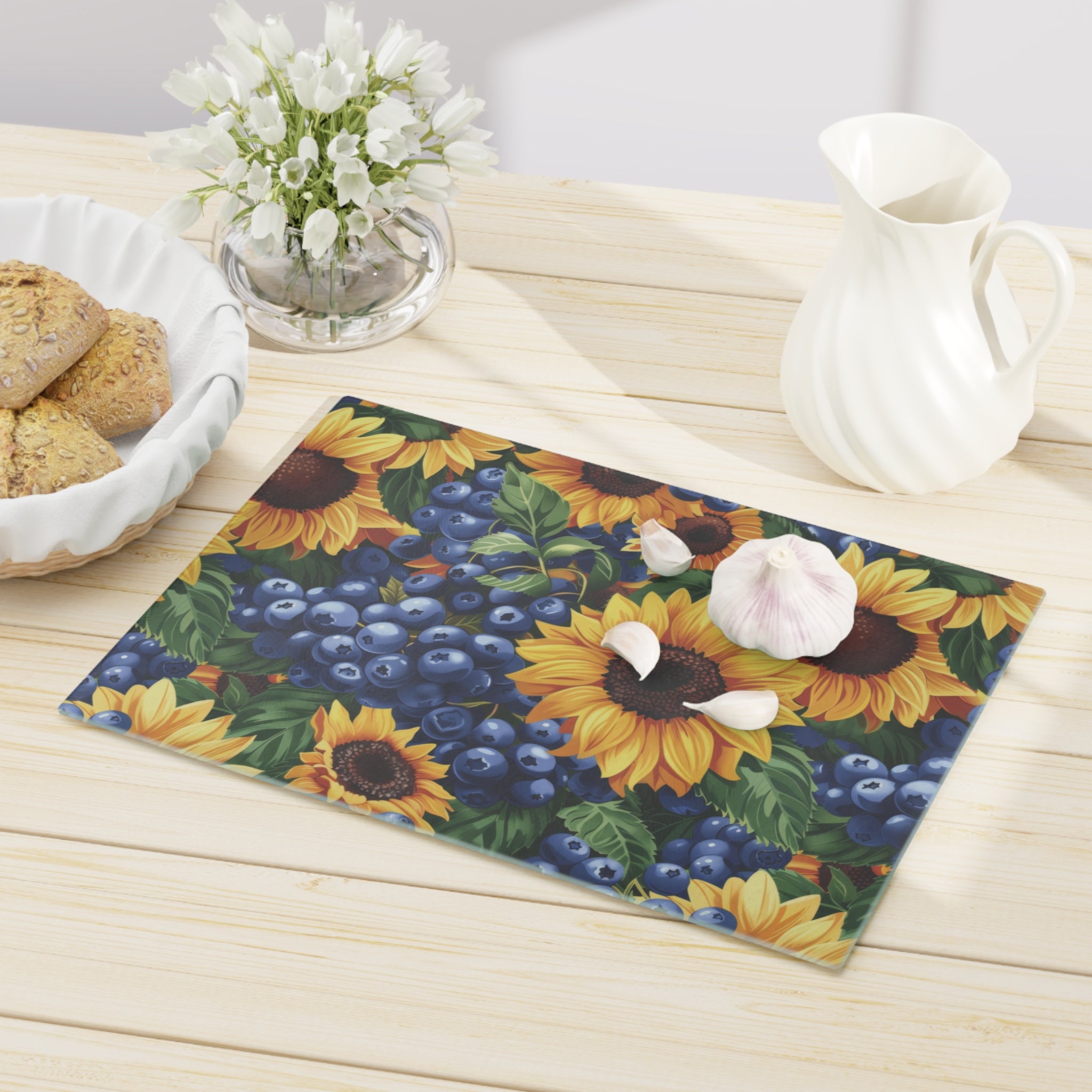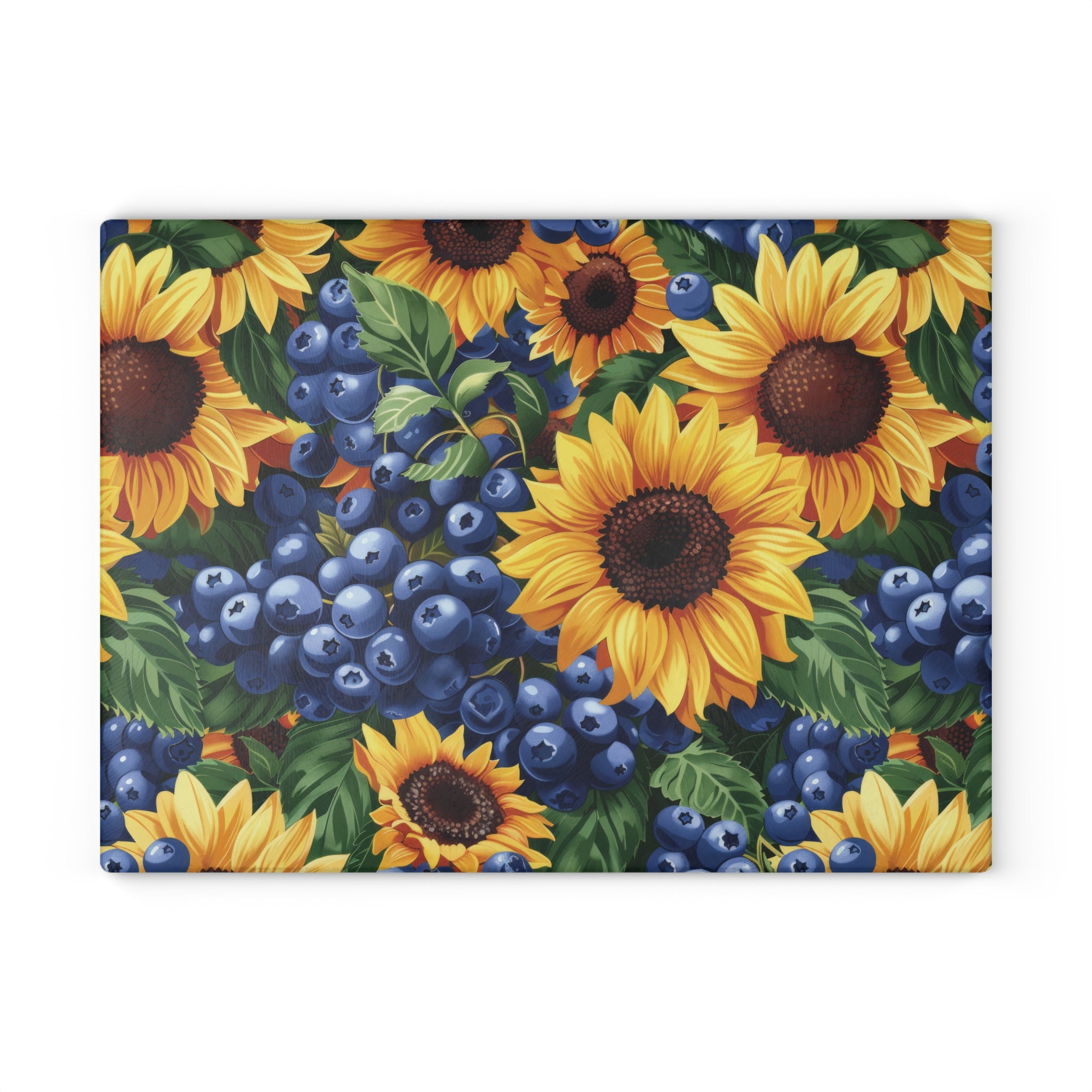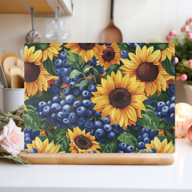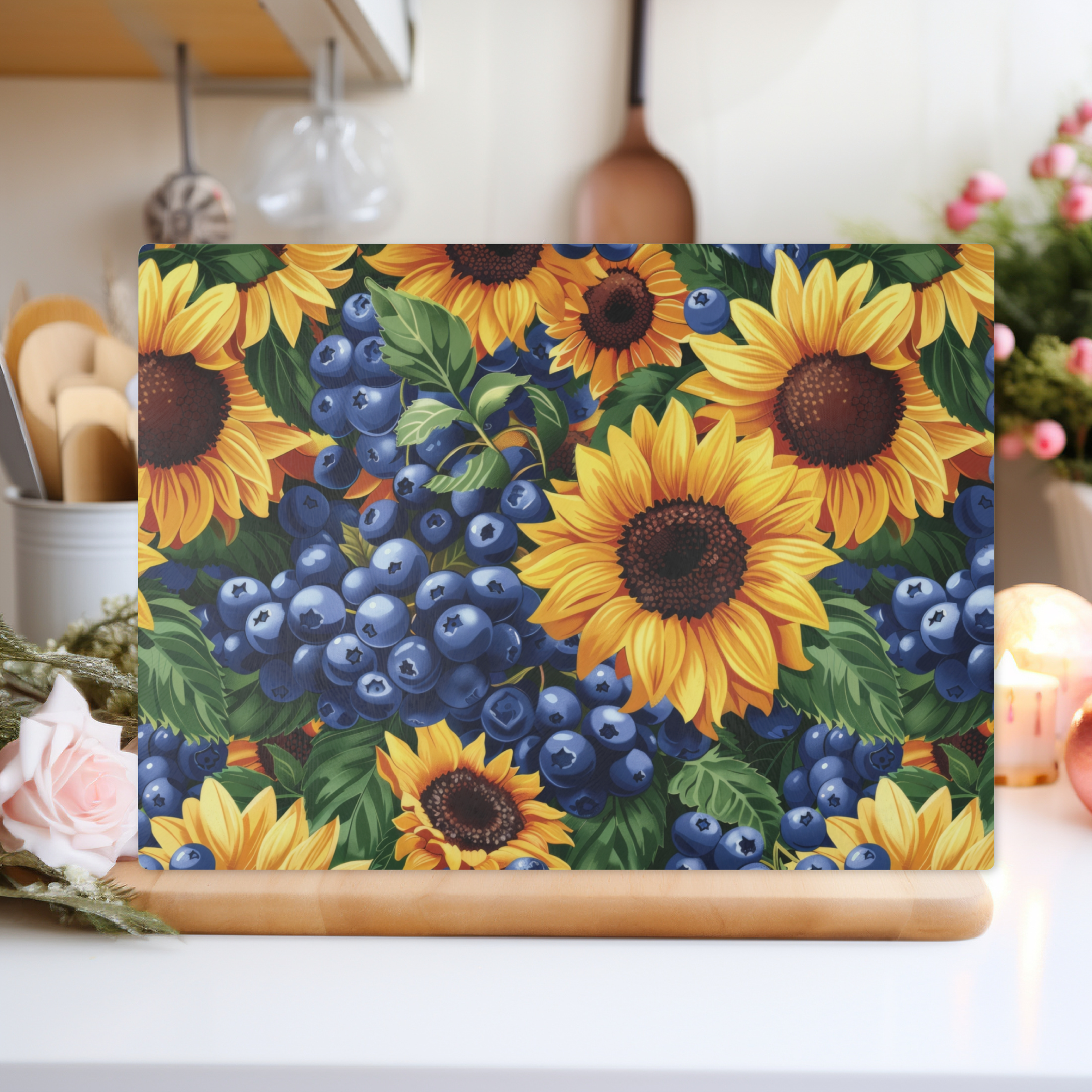 Brighten your kitchen with our Blueberry Sunflower Glass Cutting Board, a colorful floral design perfect for flower lovers and a stylish kitchen accessory. Crafted from durable tempered glass, it provides a safe, non-slip surface for all your food prep needs, making it ideal for home cooks and bakers. This unique and practical kitchen essential also makes a thoughtful gift for any occasion.